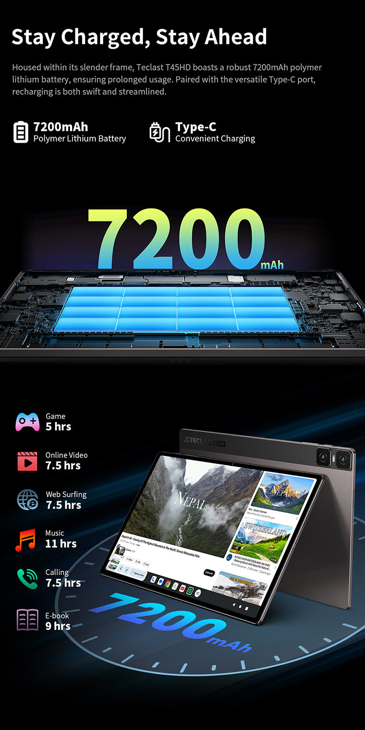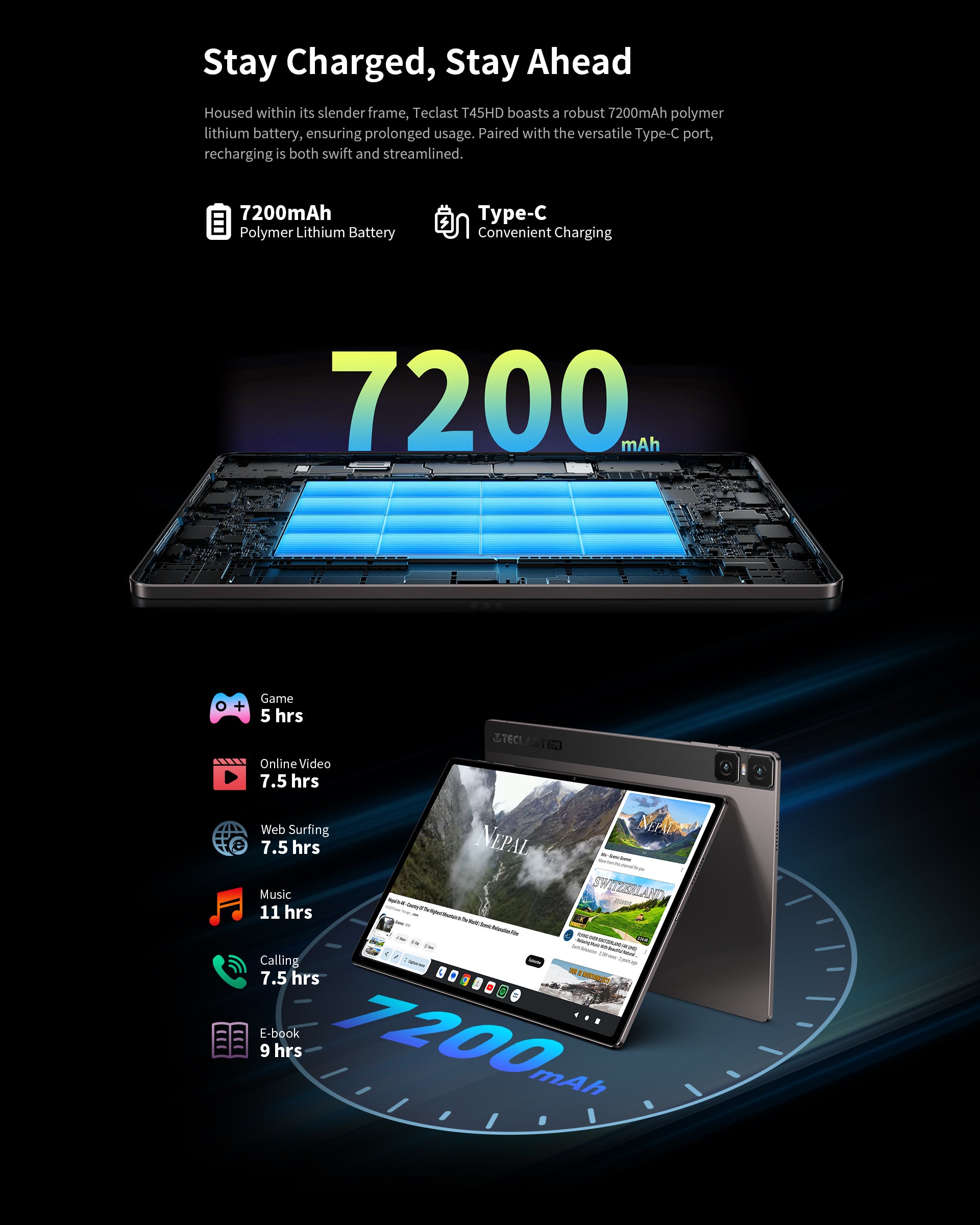 [Ricarica pratica di tipo C] Teclast T45HD vanta una batteria da 7200 mAh, abbinata alla versatile porta di tipo C, e la ricarica è rapida e semplificata.