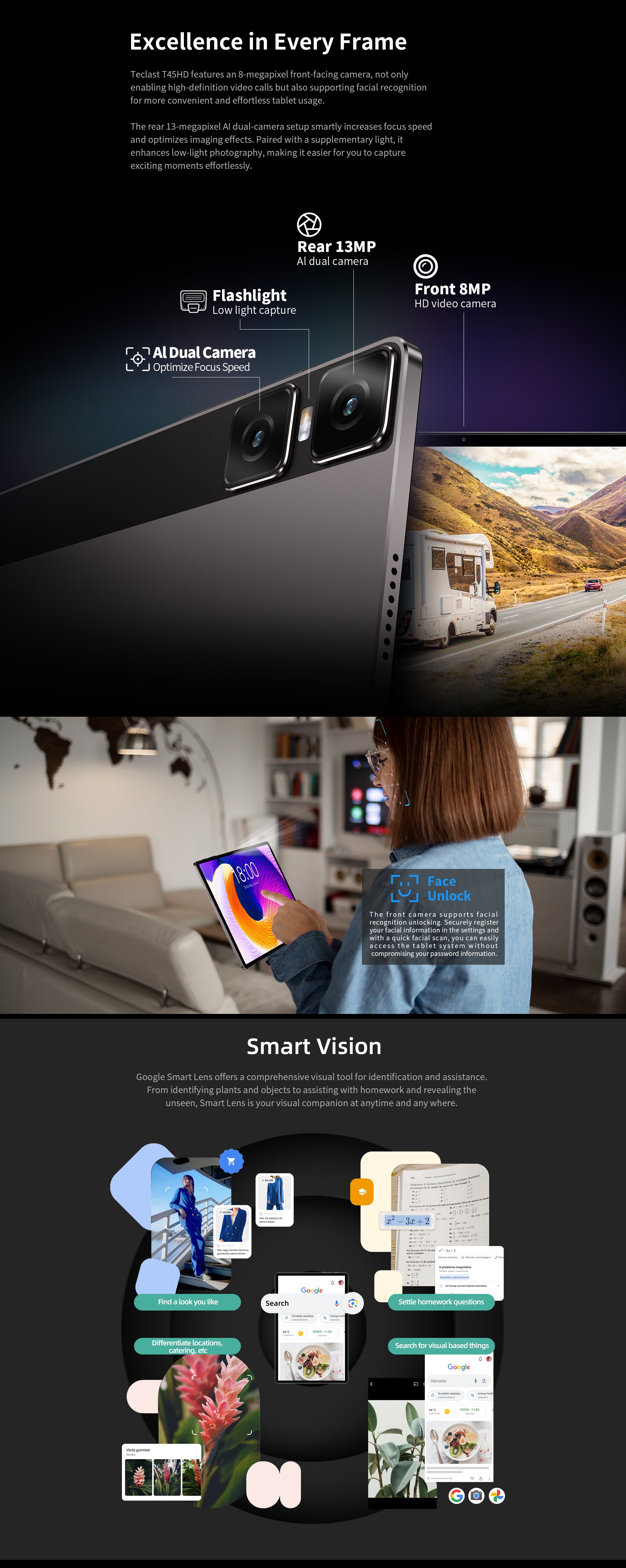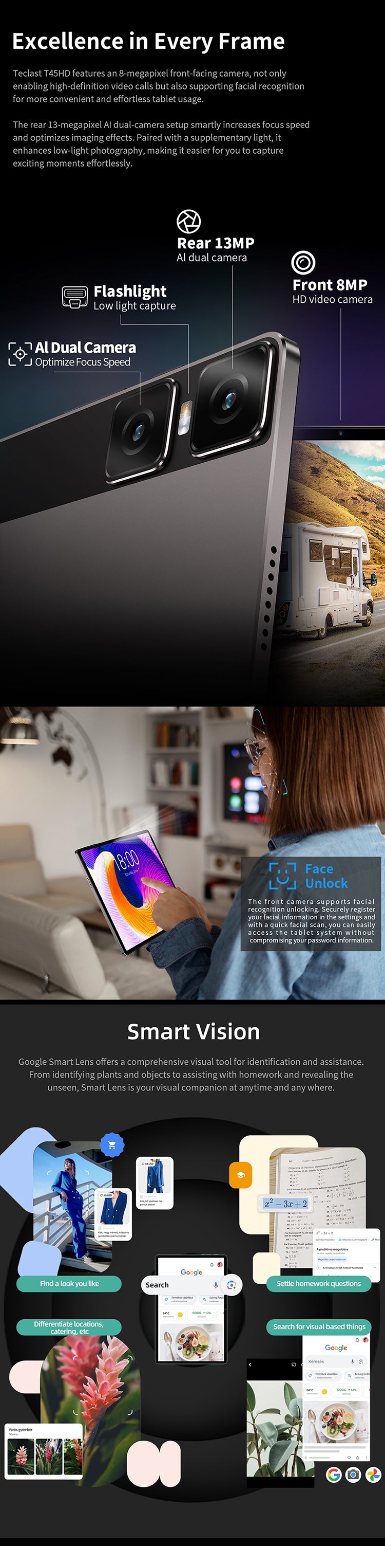 [Eccellenza in ogni fotogramma] Teclast T45HD ha una doppia fotocamera posteriore AI da 13 MP e una fotocamera frontale da 8 MP per catturare meglio momenti e chat video.