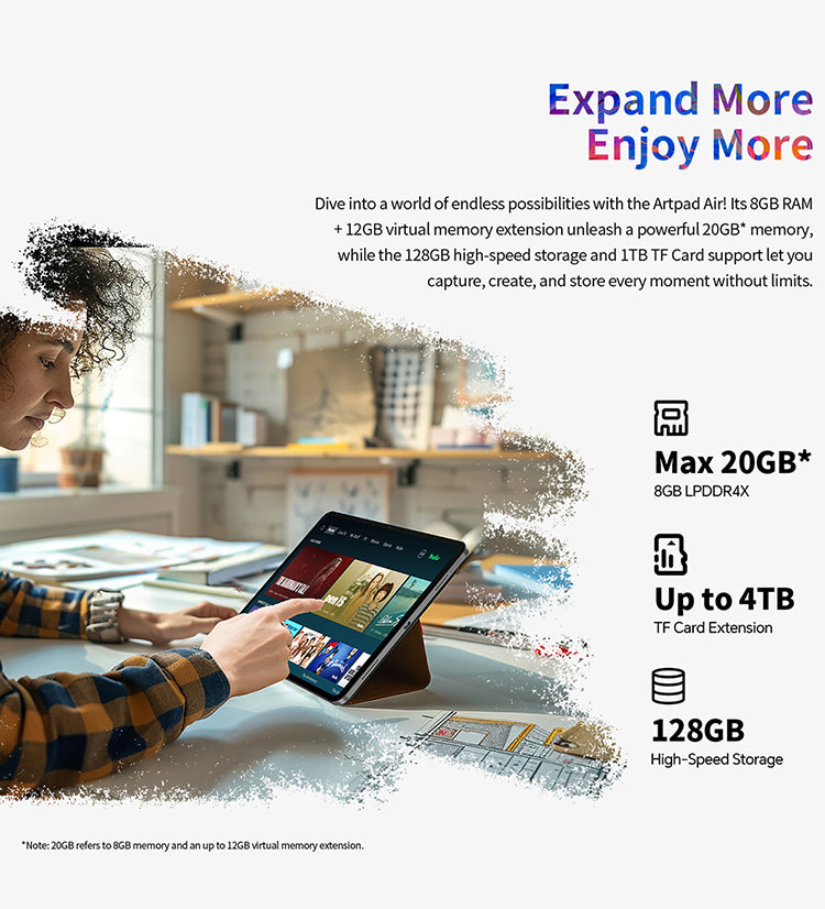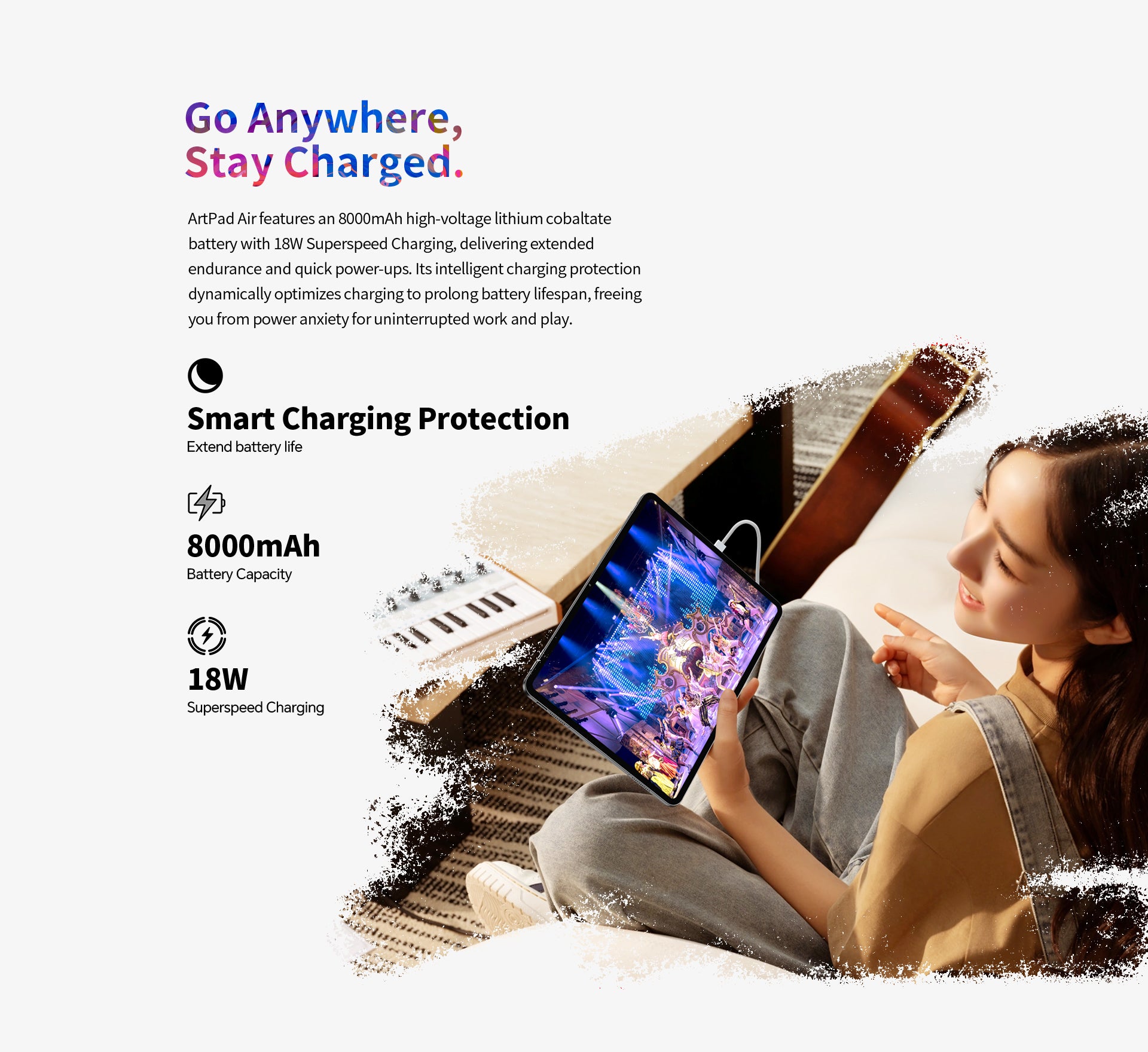 [Extended Battery Life] With a massive 8,000mAh battery, you can keep creating for hours without needing to recharge. The 18W superspeed charging ensures you can power up quickly and get back to work without any unnecessary downtime. Smart charging protection provides safety against overcharging and overheating.