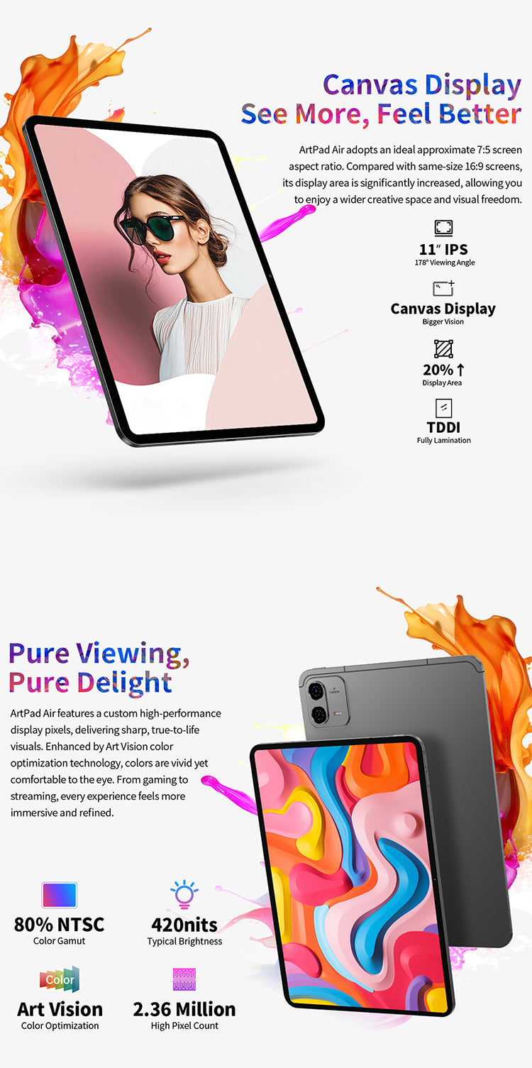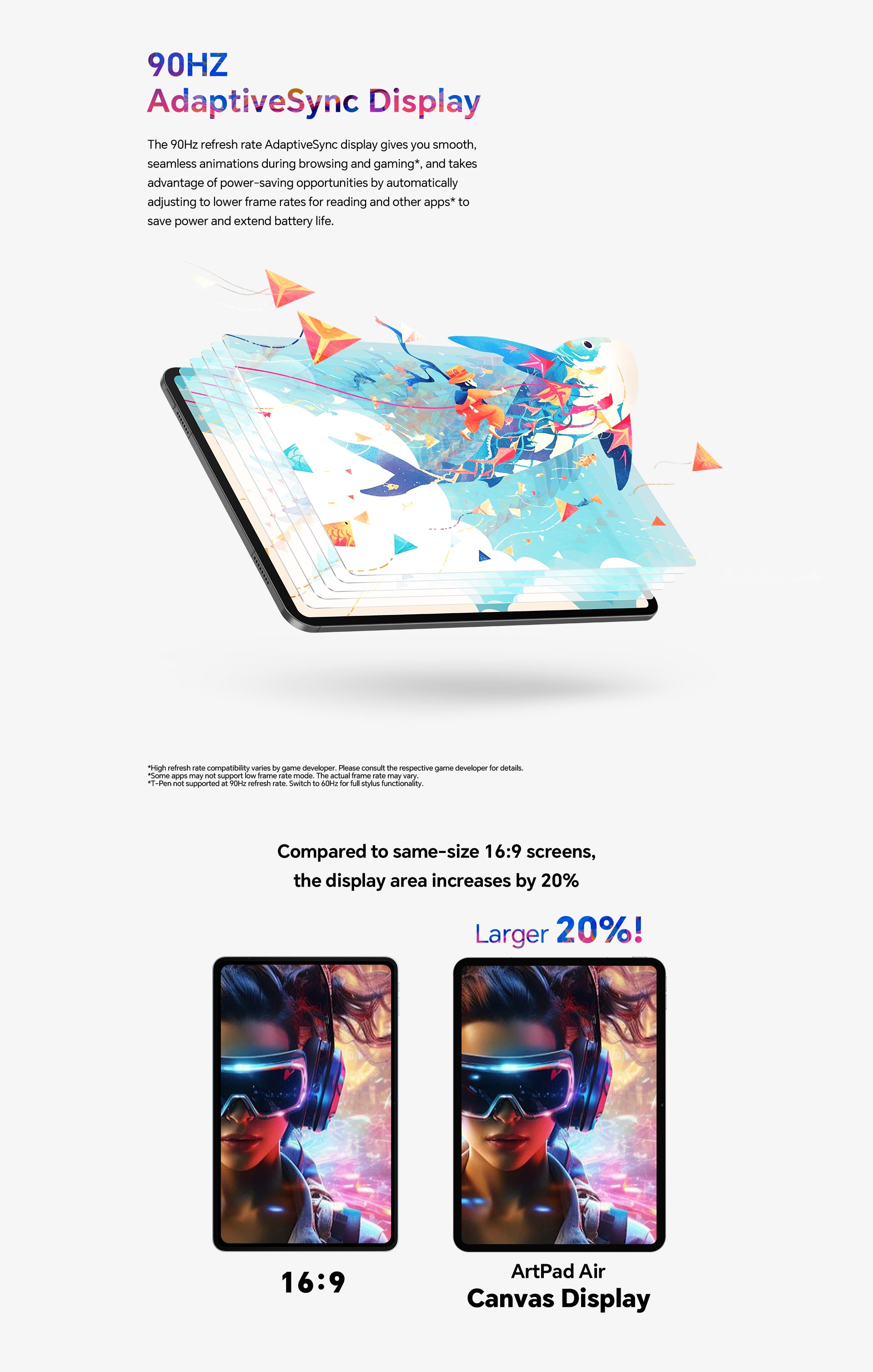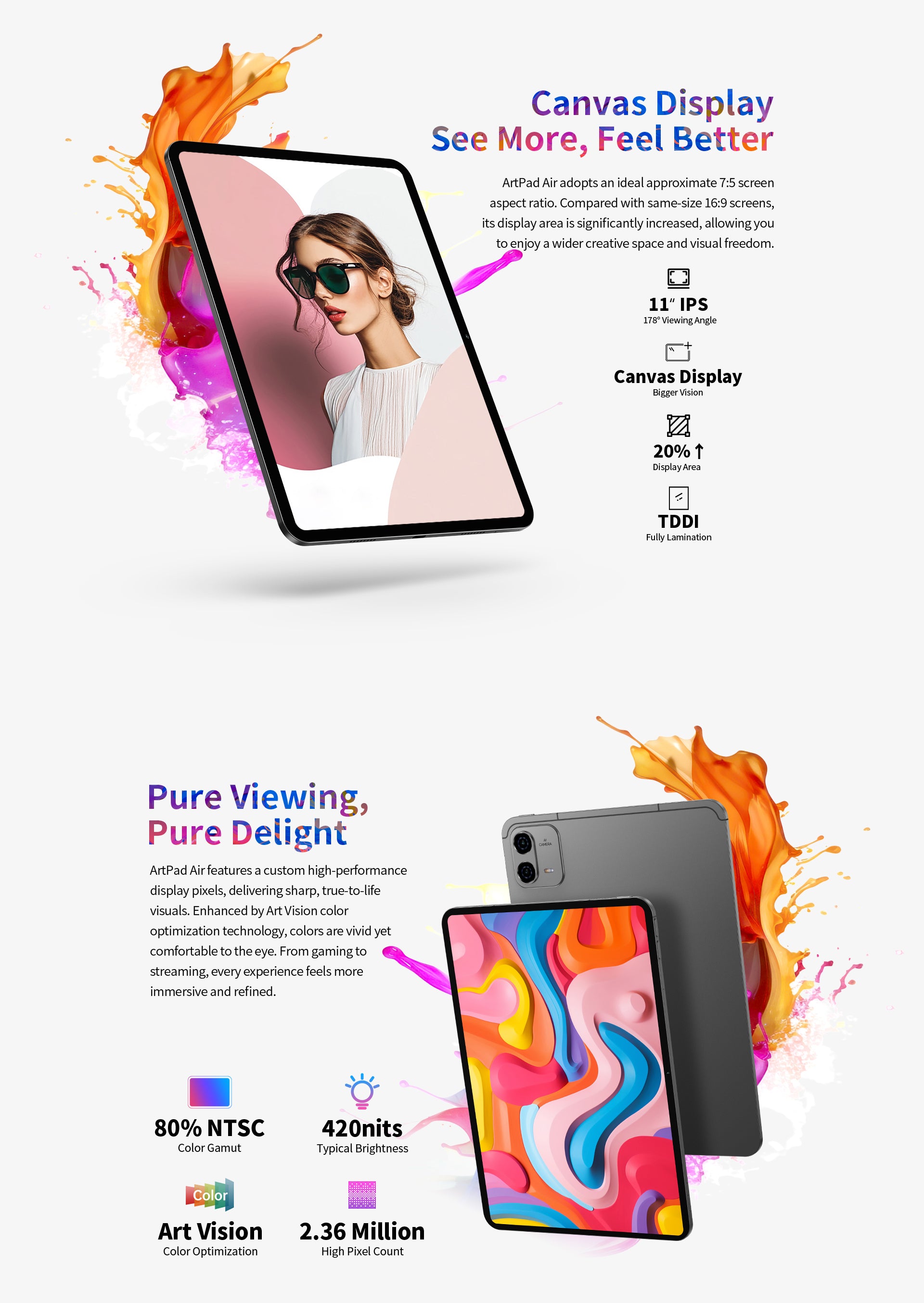 [Canvas Display] The ArtPad Air's Canvas Display features an ideal aspect ratio for creating, offering 20% more workspace compared to standard 16:9 screens. With uniform narrow borders, the design provides a larger, more immersive screen area, making it perfect for references, free creation, and precise edits without distractions.