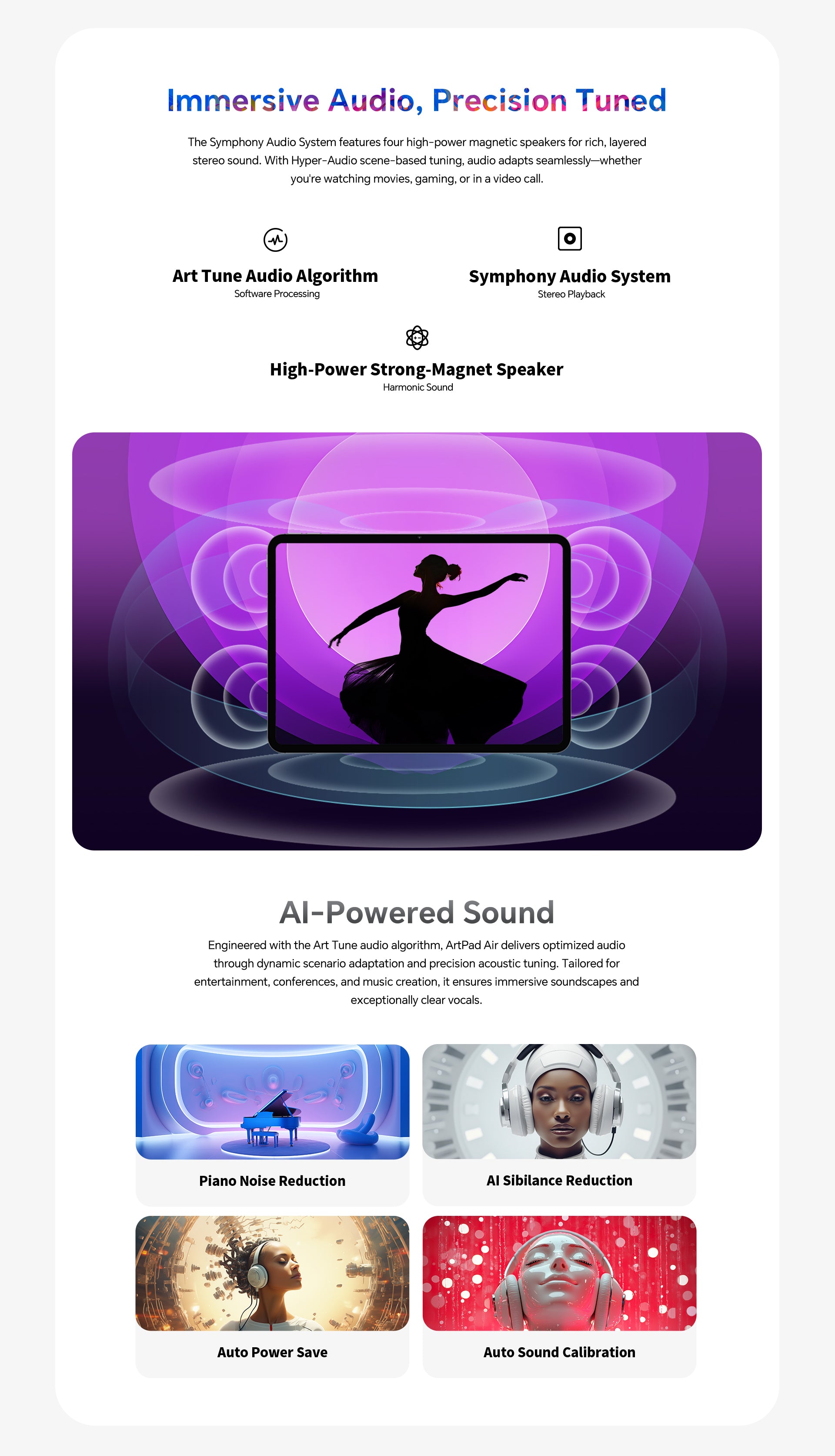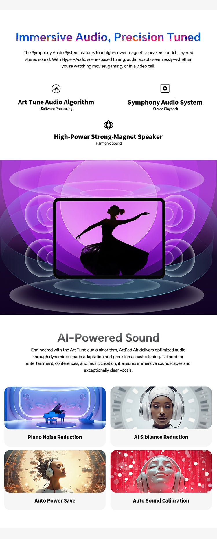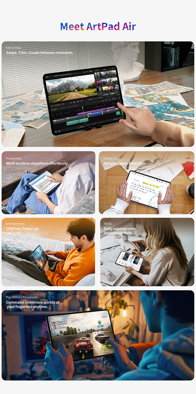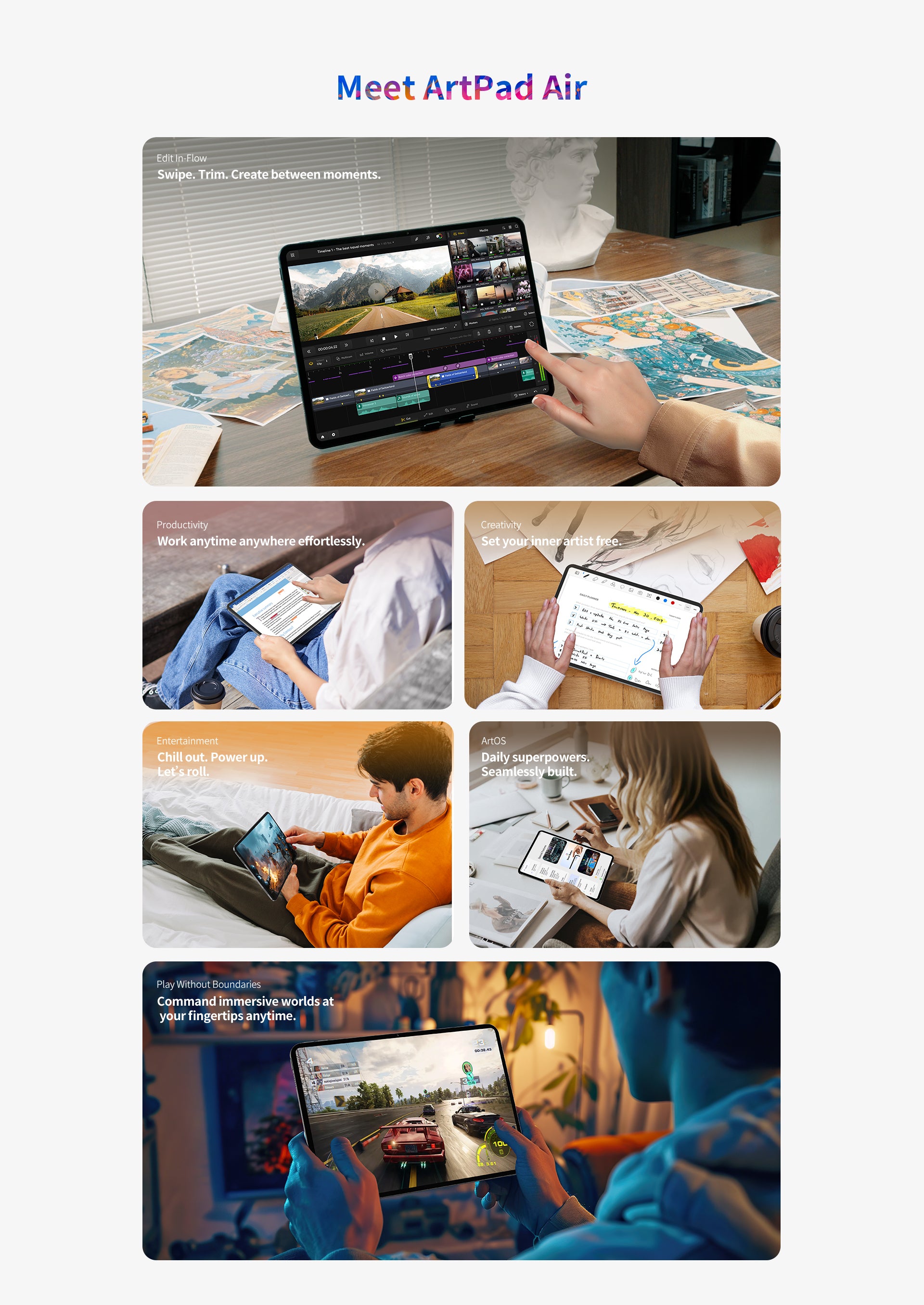 [Canvas Display] The ArtPad Air's Canvas Display features an ideal aspect ratio for creating, offering 20% more workspace compared to standard 16:9 screens. With uniform narrow borders, the design provides a larger, more immersive screen area, making it perfect for references, free creation, and precise edits without distractions.