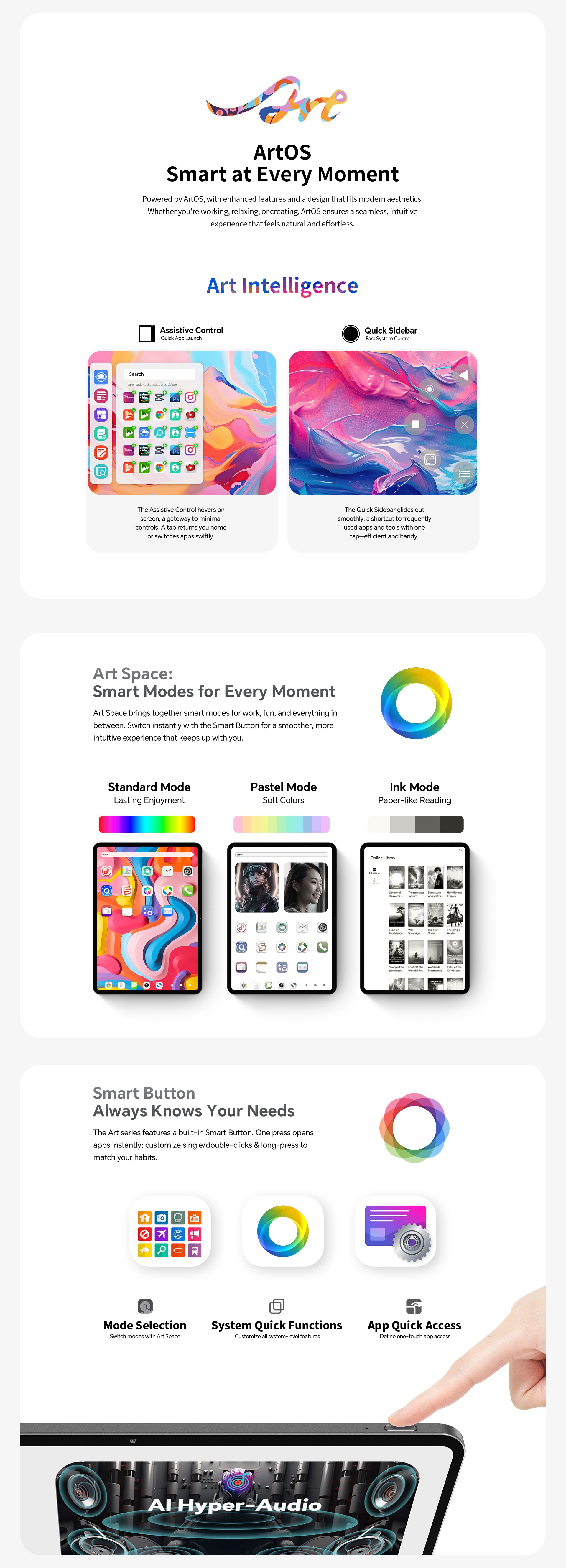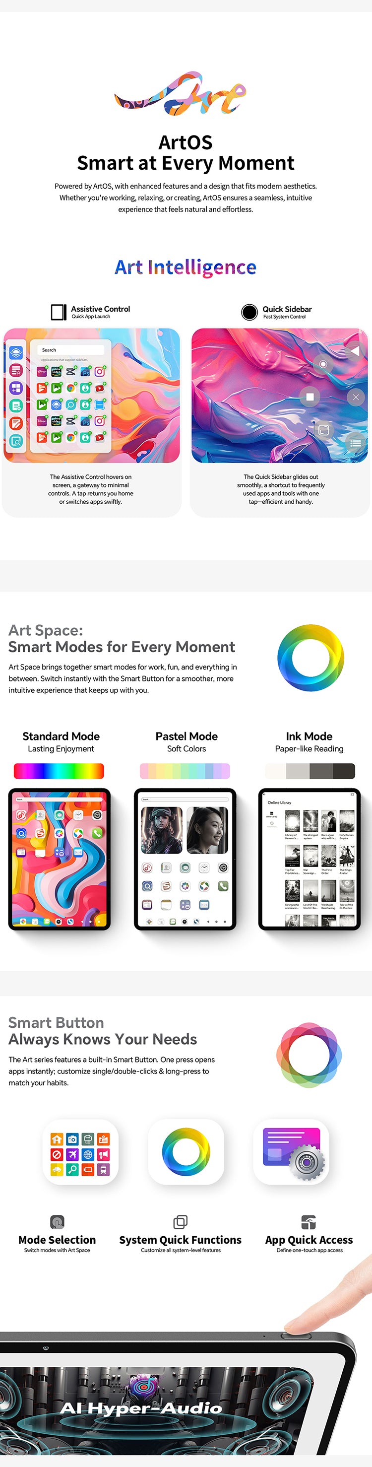 [Android with ArtOS] ArtOS allows you to customize your workspace with profiles designed for specific activities such as drawing or editing. The quick sidebar provides instant access to tools and apps, enhancing multitasking, while assistive control features help users navigate the tablet with ease, offering accessibility to everyone.