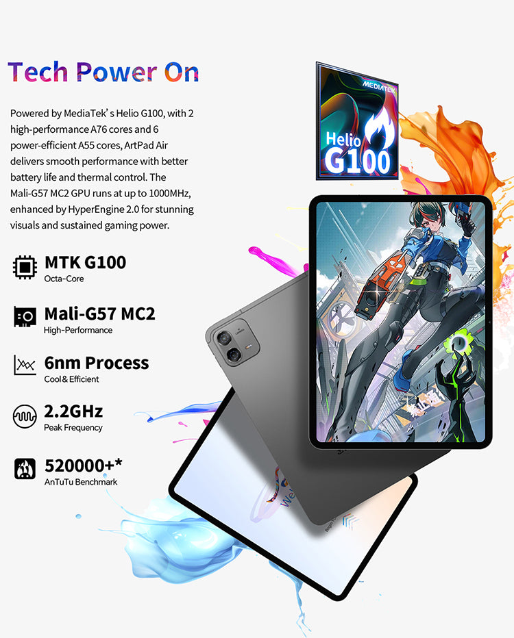 [Premium Performance] Powered by the MTK Helio G100 Octa-Core processor, the device delivers powerful processing for smooth multitasking and fast performance. The efficient 6nm process ensures optimal battery life, while the high AnTuTu score (400000+) demonstrates exceptional system responsiveness and app performance.