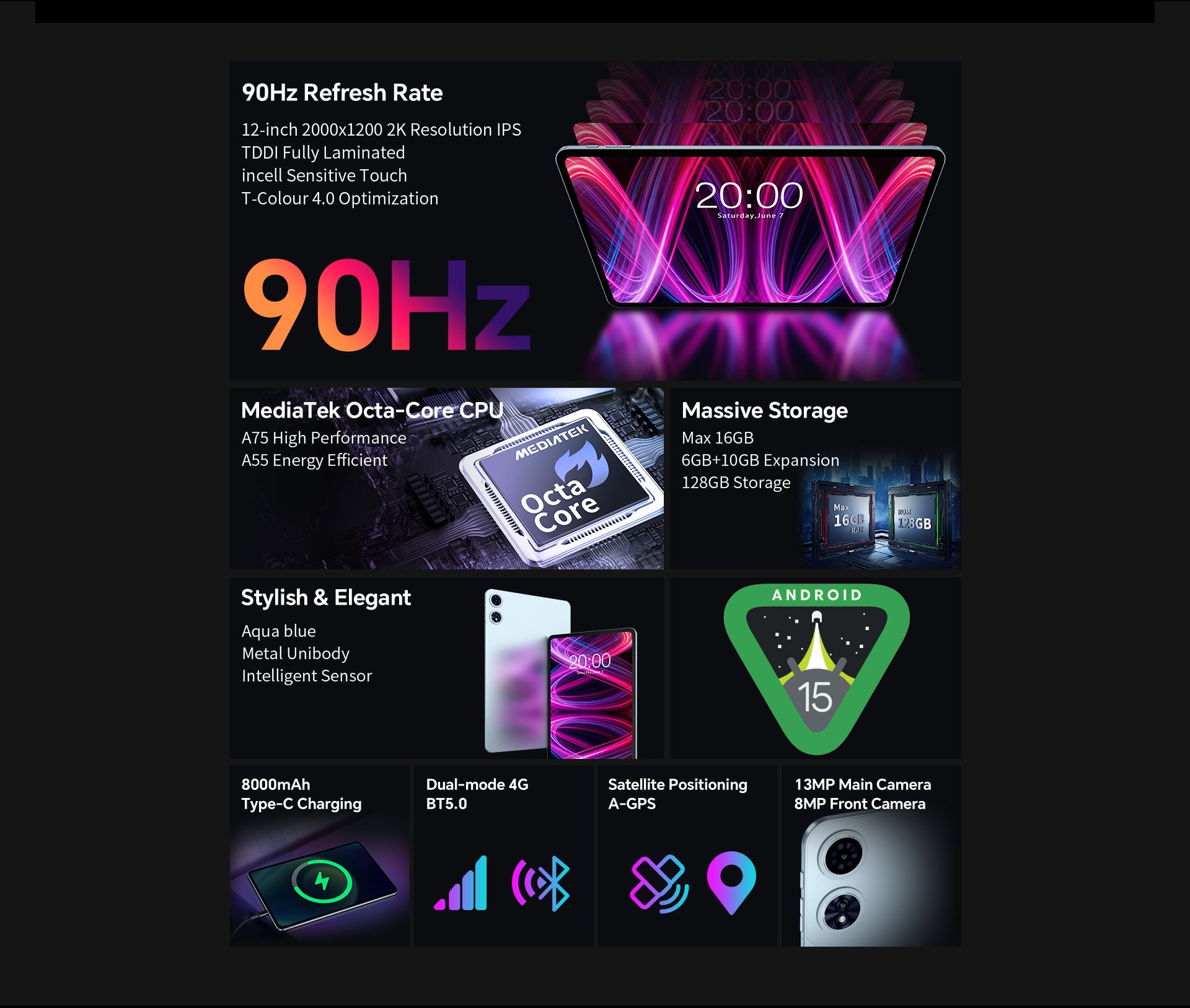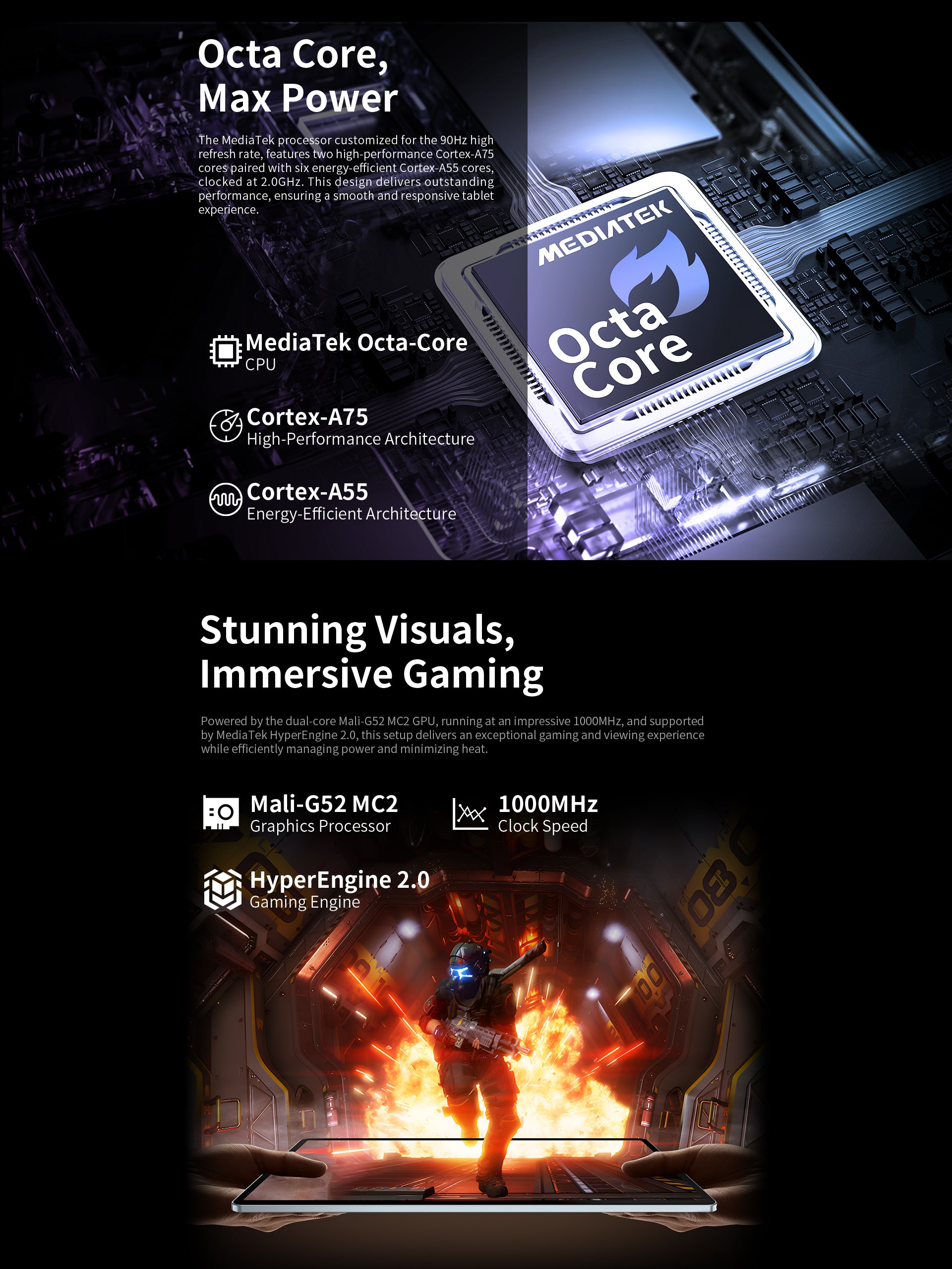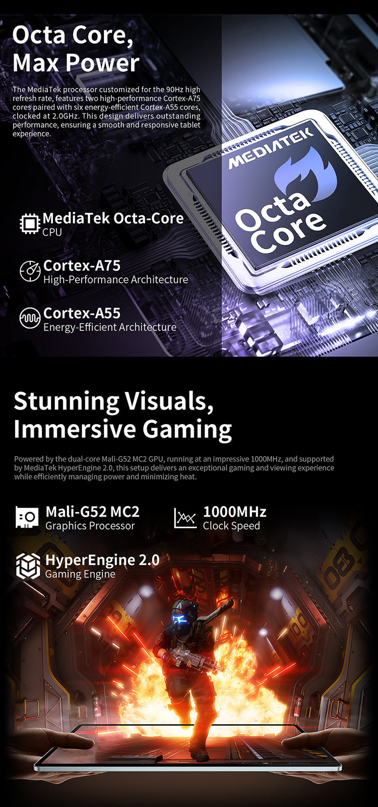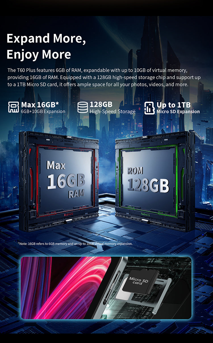 [Max Speed at Your Fingertips] T60 Plus is powered by the MediaTek Octa-Core chipset, complemented by up to 16GB RAM (6GB with an additional 10GB RAM Expansion) and 128GB internal storage, expandable to 1TB with a Micro SD card.