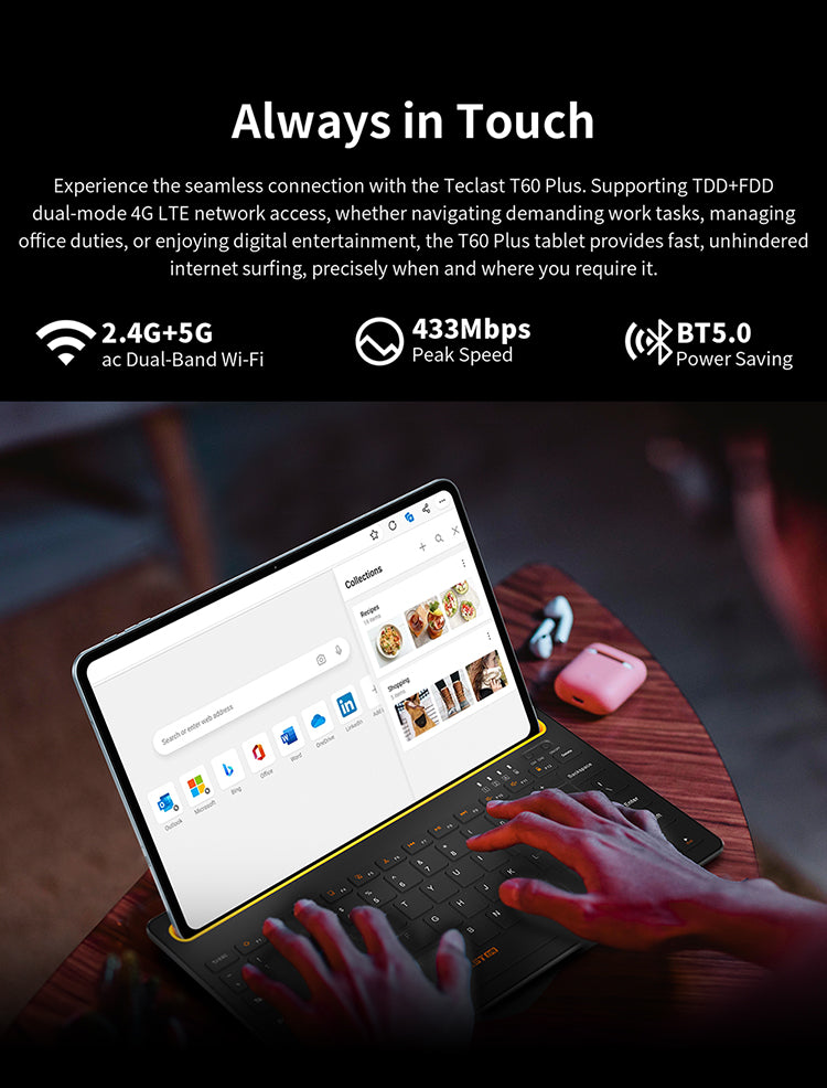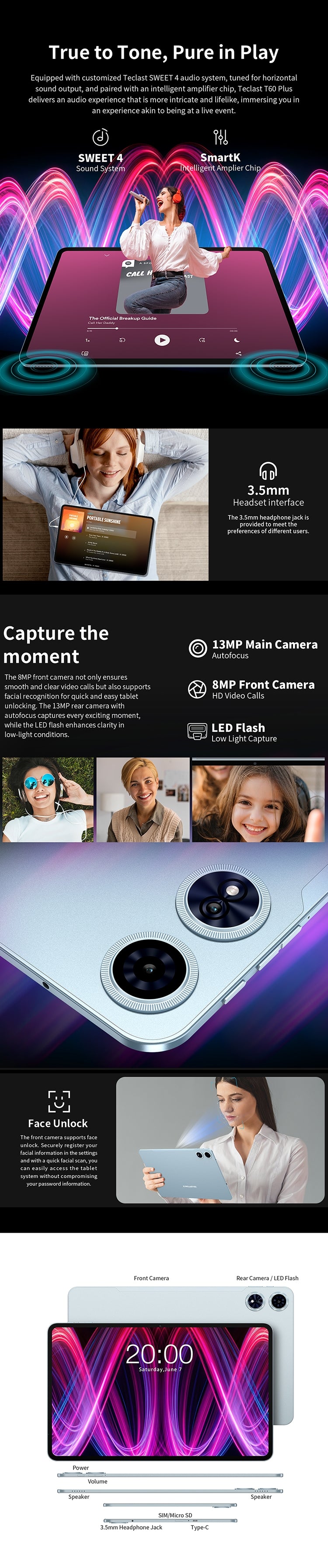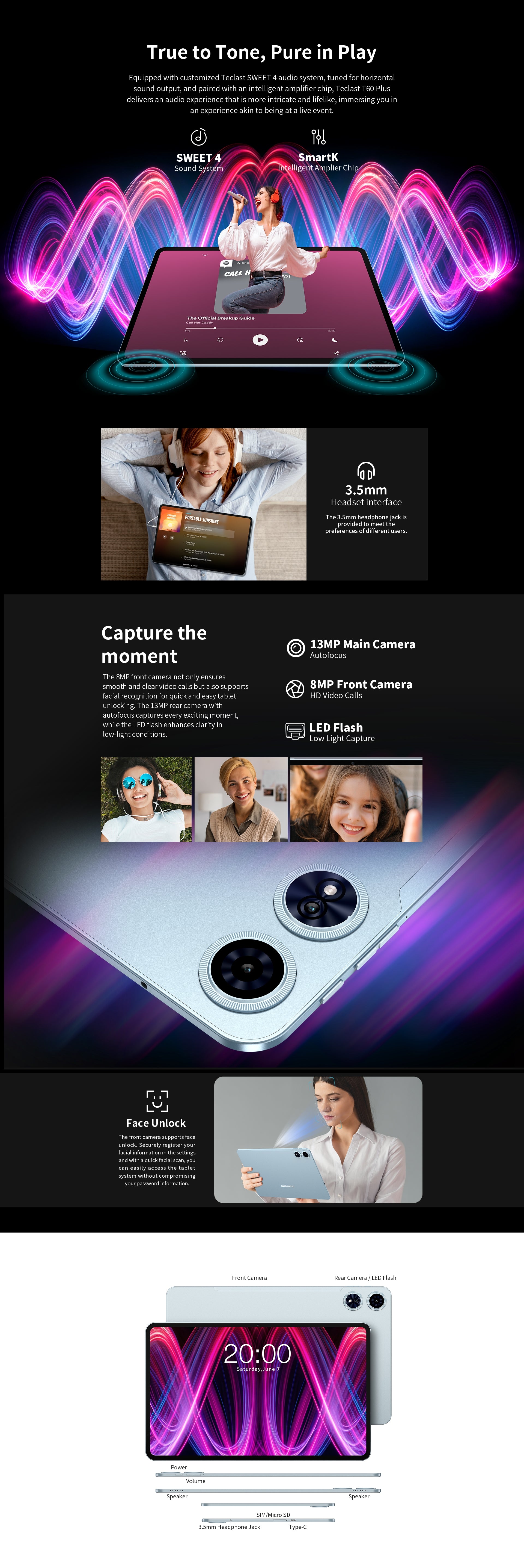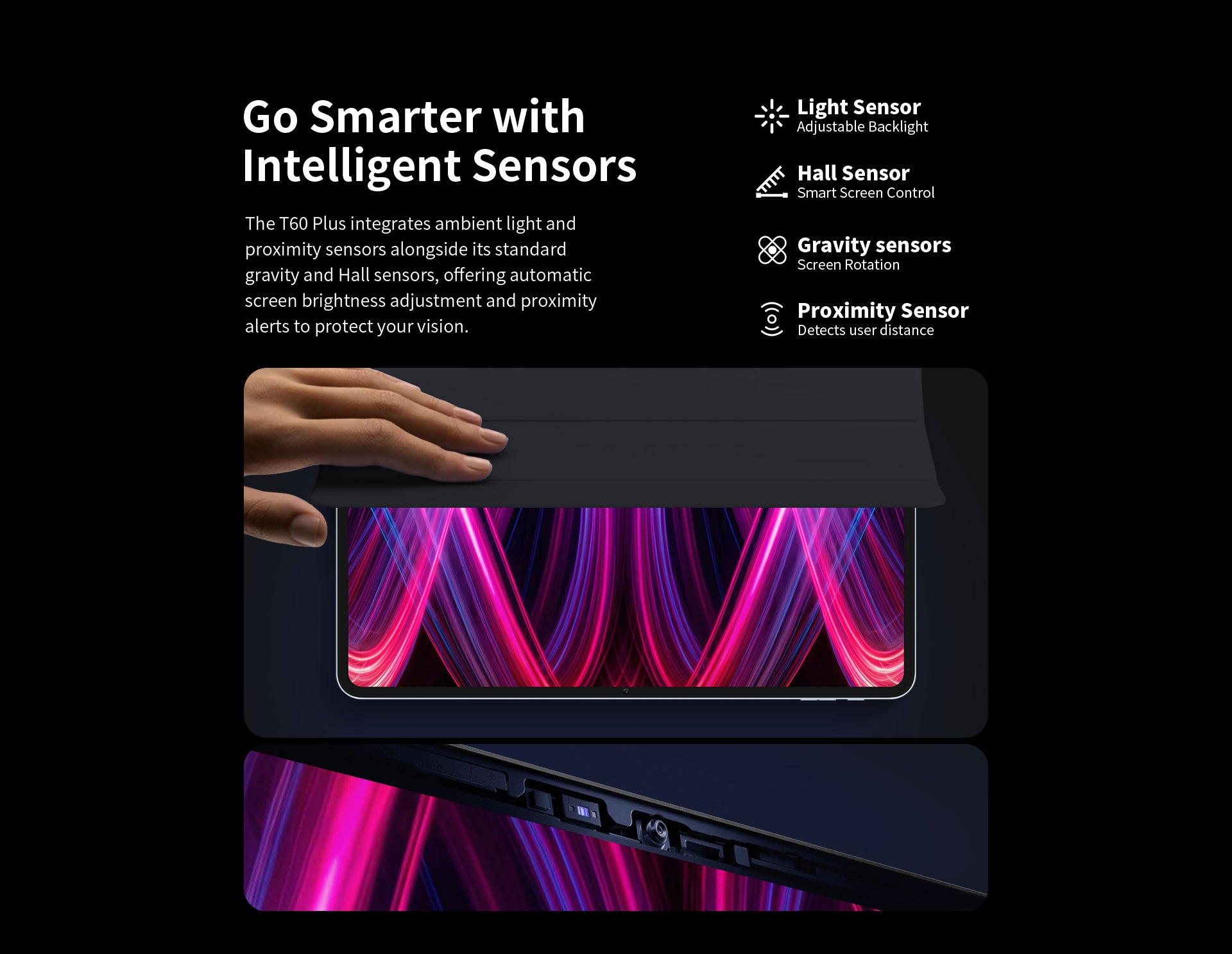 [Max Sensory Intelligence] The T60 Plus integrates light, hall, and proximity sensors for a smart tablet experience. Pair it with the T60 Plus folio case for smart device wake-up. Also, its built-in gyroscope offers exceptional control for gaming and app interactions.