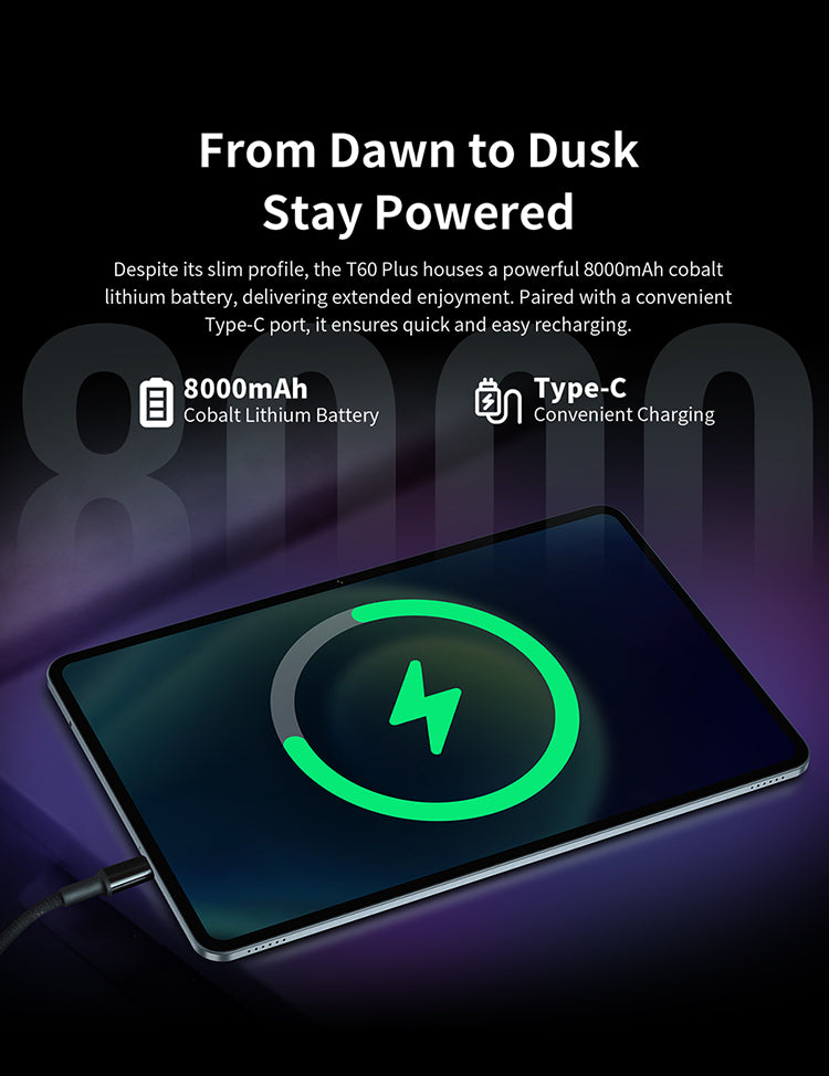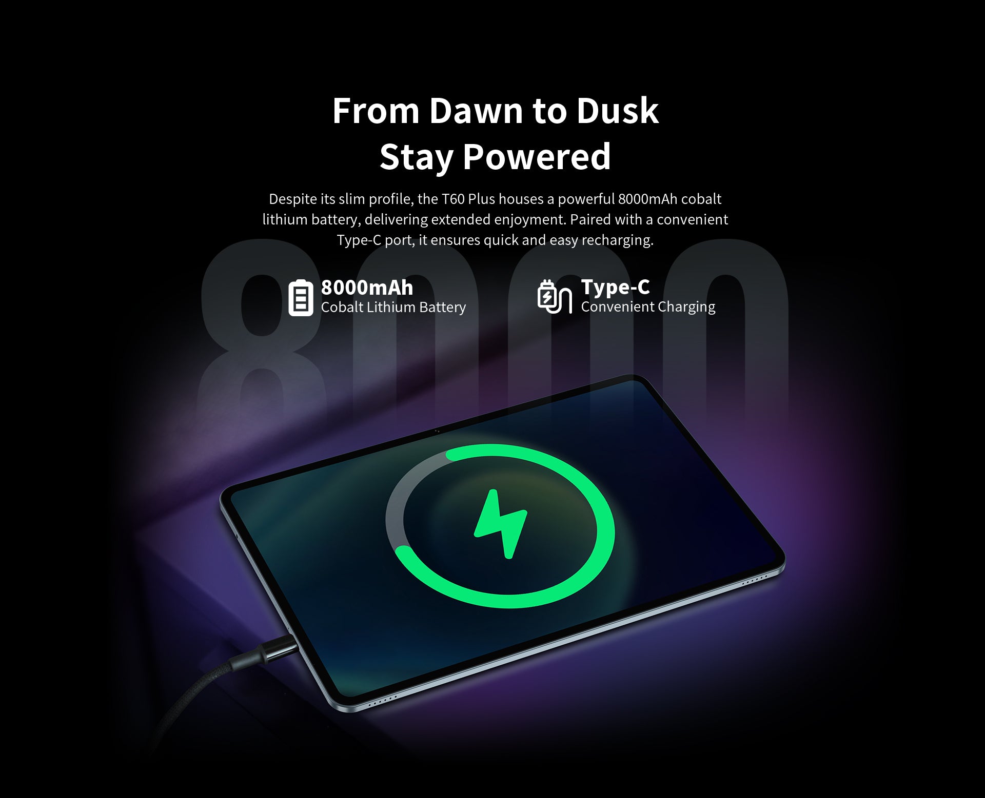 [Max Enduring Power] The T60 Plus houses an 8000mAh battery, ensuring up to 10 hours of daily usage.