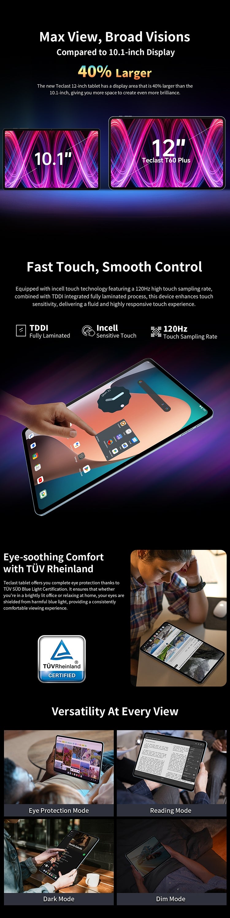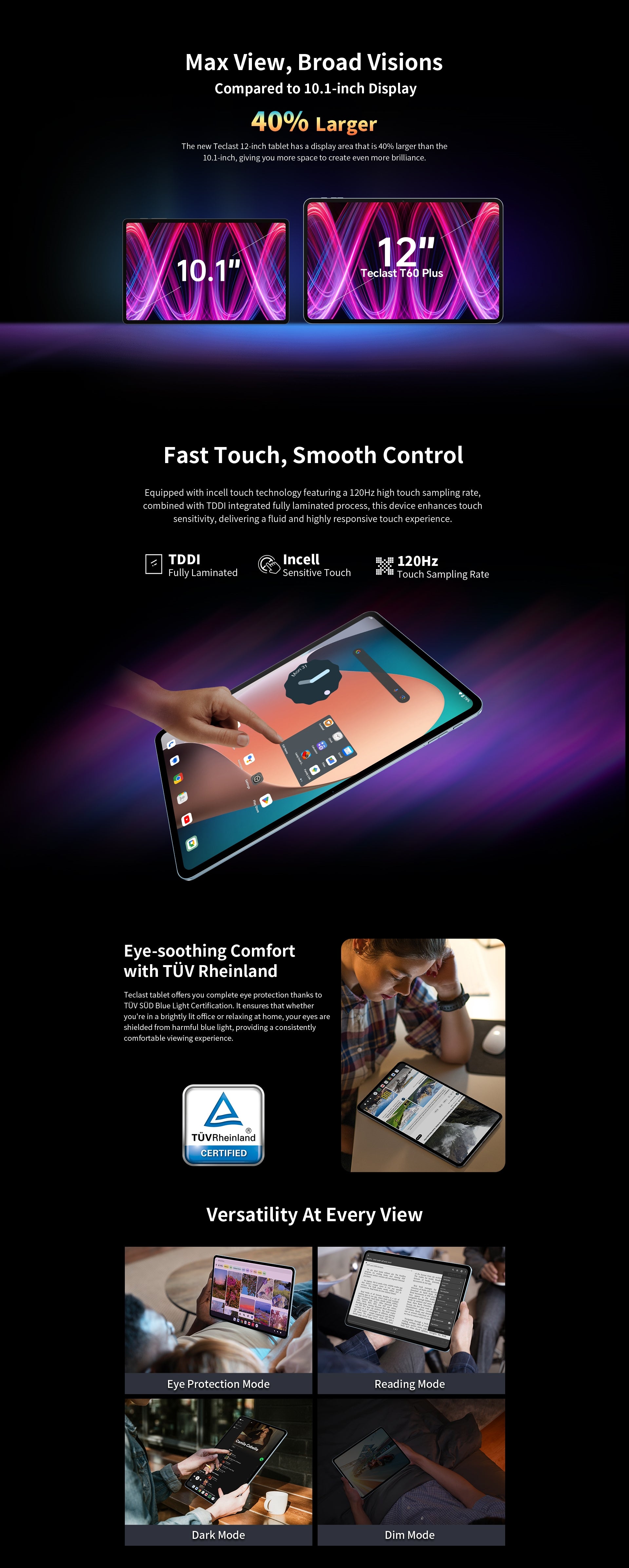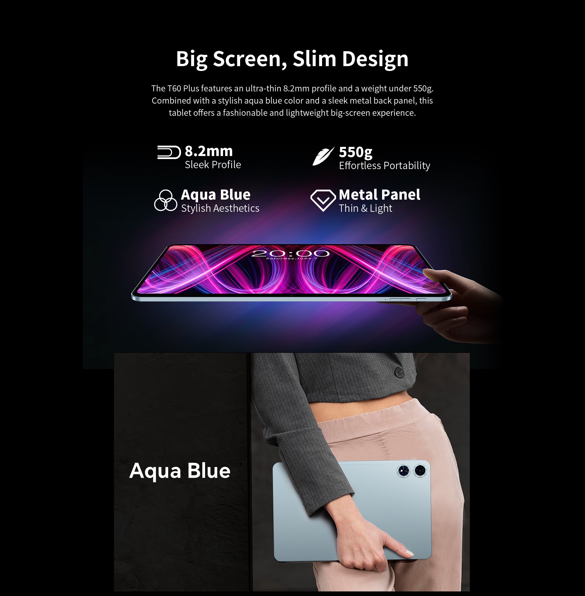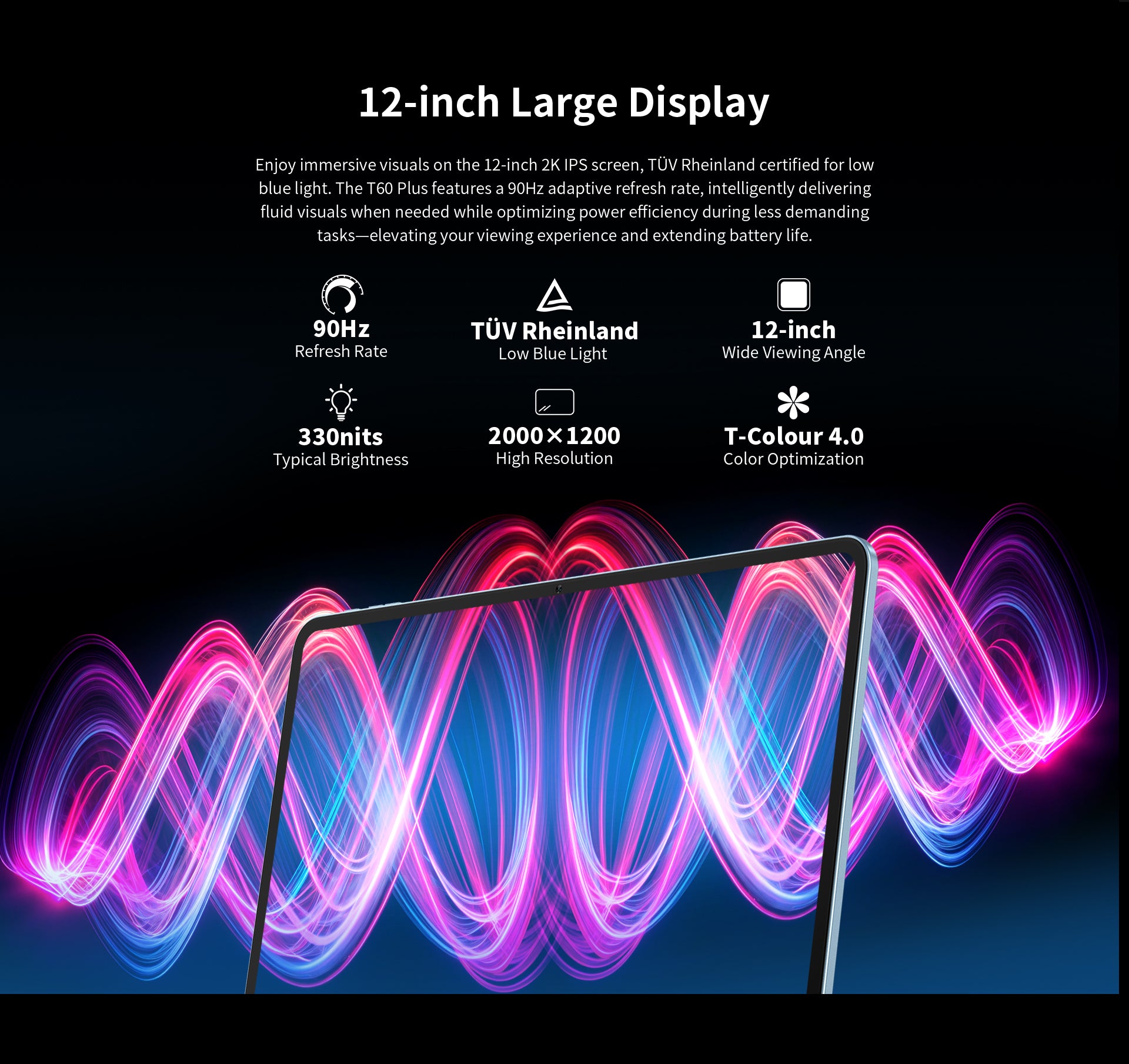 [Max 12-inch Display] T60 Plus boasts a sleek 12-inch screen, accentuated by a slim 6.5mm bezel. With an impressive 92% screen-to-body ratio, dive deeper into work, entertainment, and gameplay.
