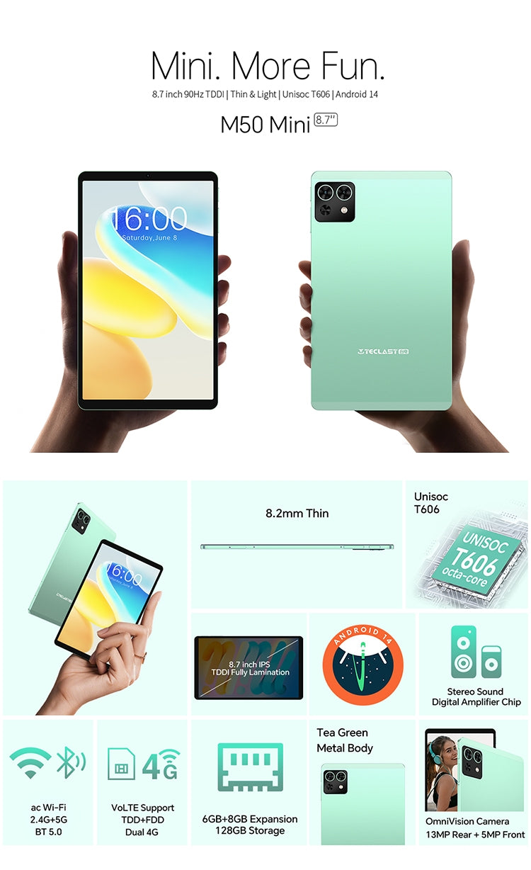 [Powerful Performance] The M50 Mini's T606 octa-core processor delivers robust performance, efficiently powering through tasks while conserving energy. Its Mali-G57 GPU enhances your multimedia experiences, ensuring that every visual and sound is rendered in stunning detail.