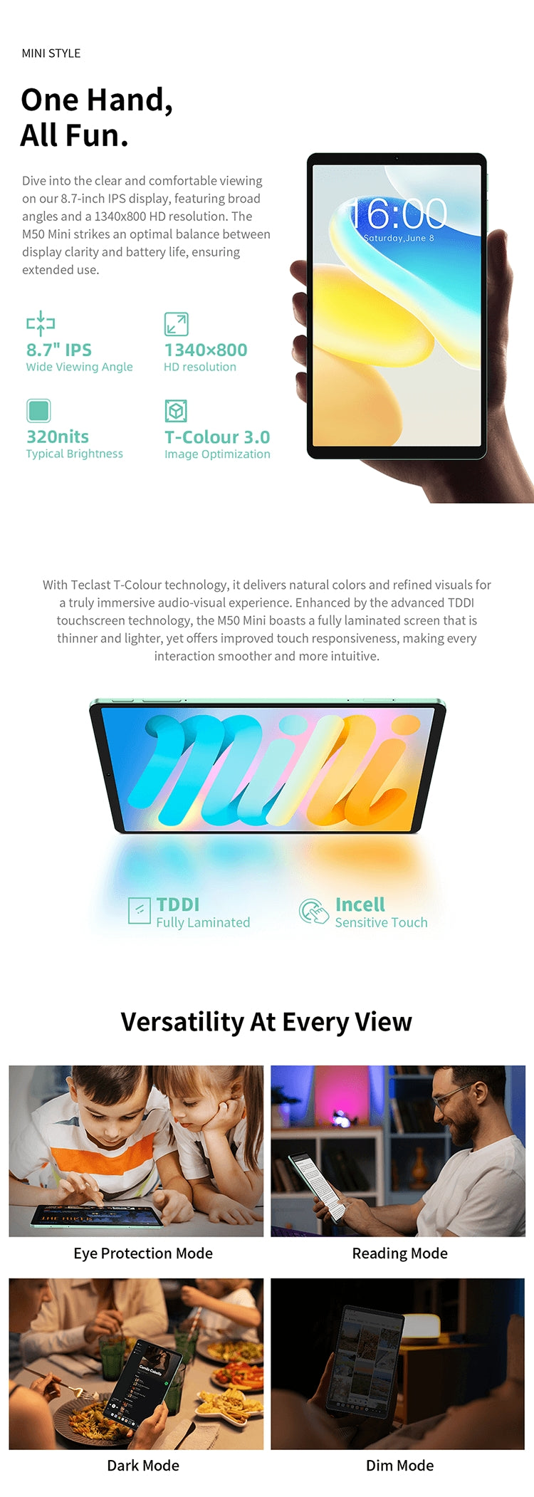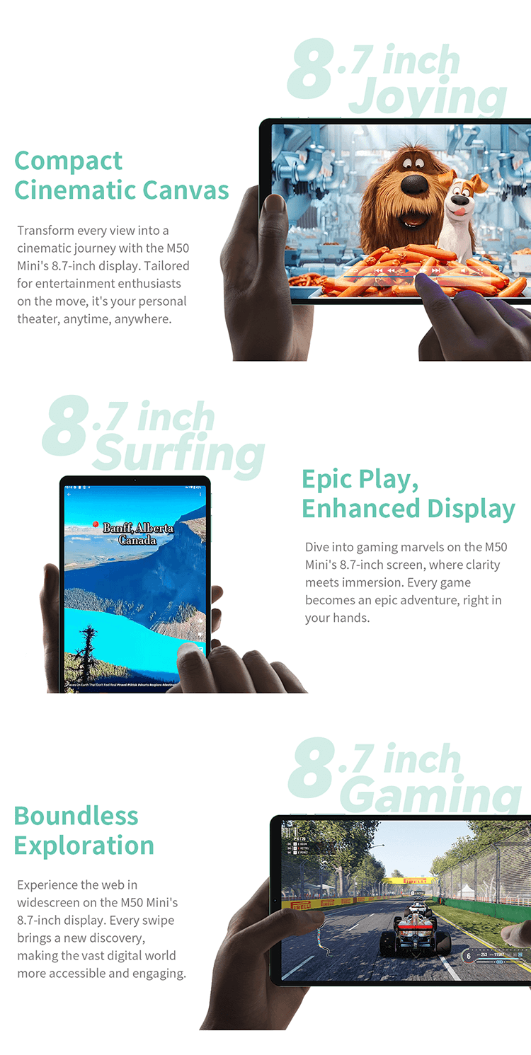 [Exceptional Display] The M50 Mini features an 8.7-inch 90Hz TDDI Fully Laminated display with 1340x800 resolution and 16:10 aspect ratio for an immersive viewing experience. The 90Hz refresh rate ensures smooth, fluid visuals, perfect for both work and play.
