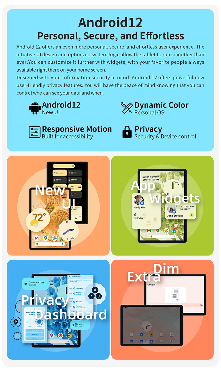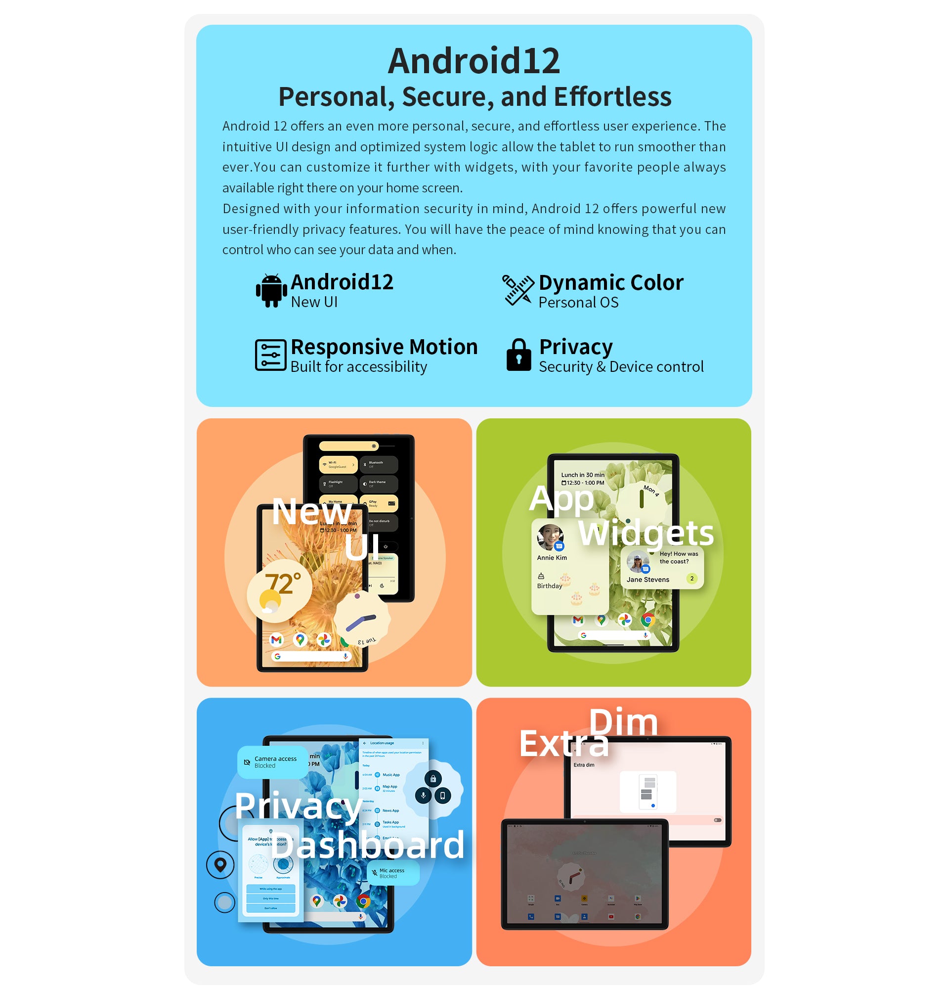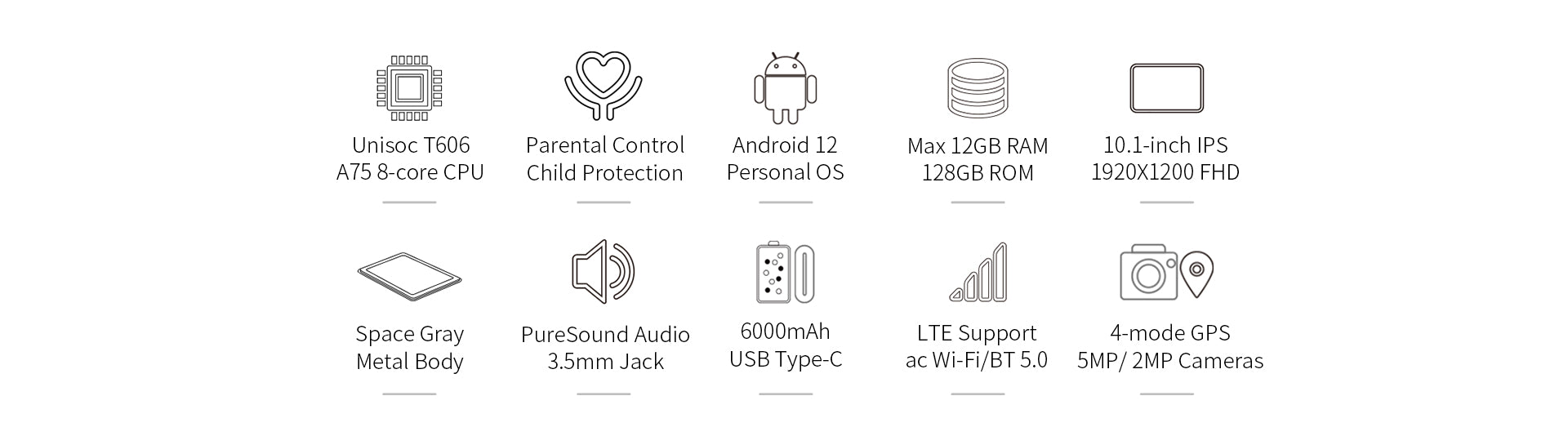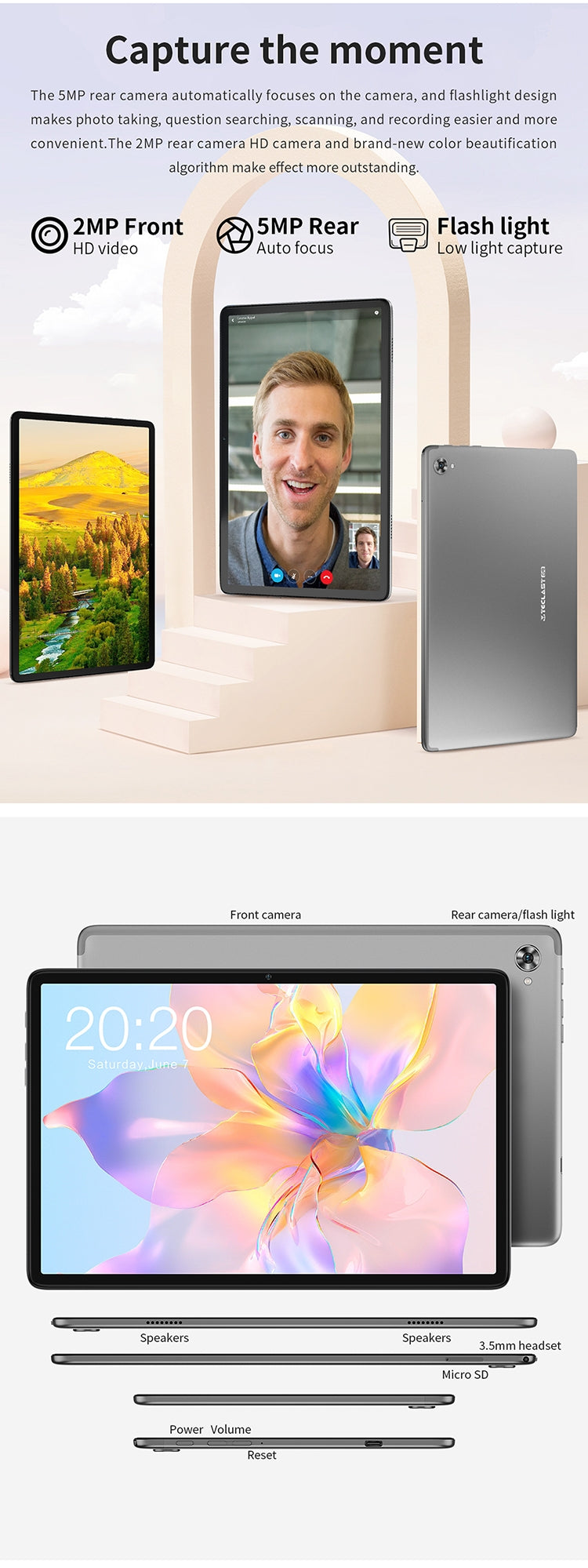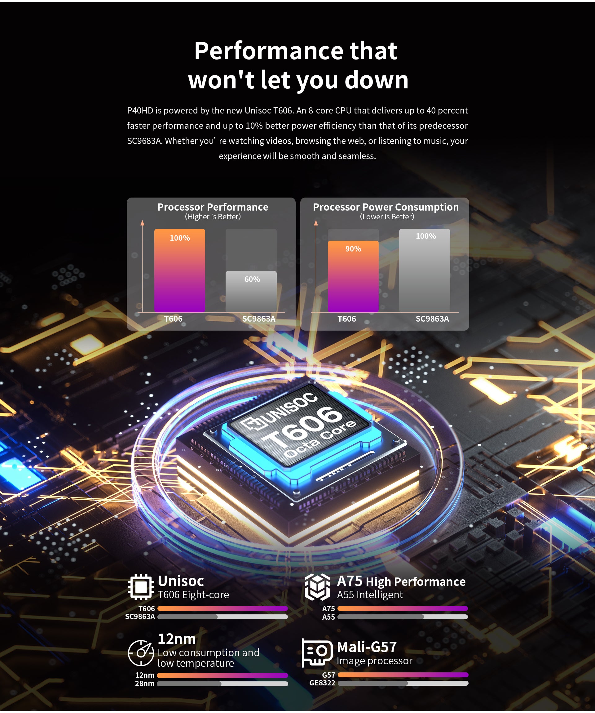 [Intelligent 8-Core Processor] P40HD is powered by a Unisoc T606 A75 8-core processor. The advanced 12nm process uses less power and produces less heat while maintaining high performance and frequency at 1.6 GHz.