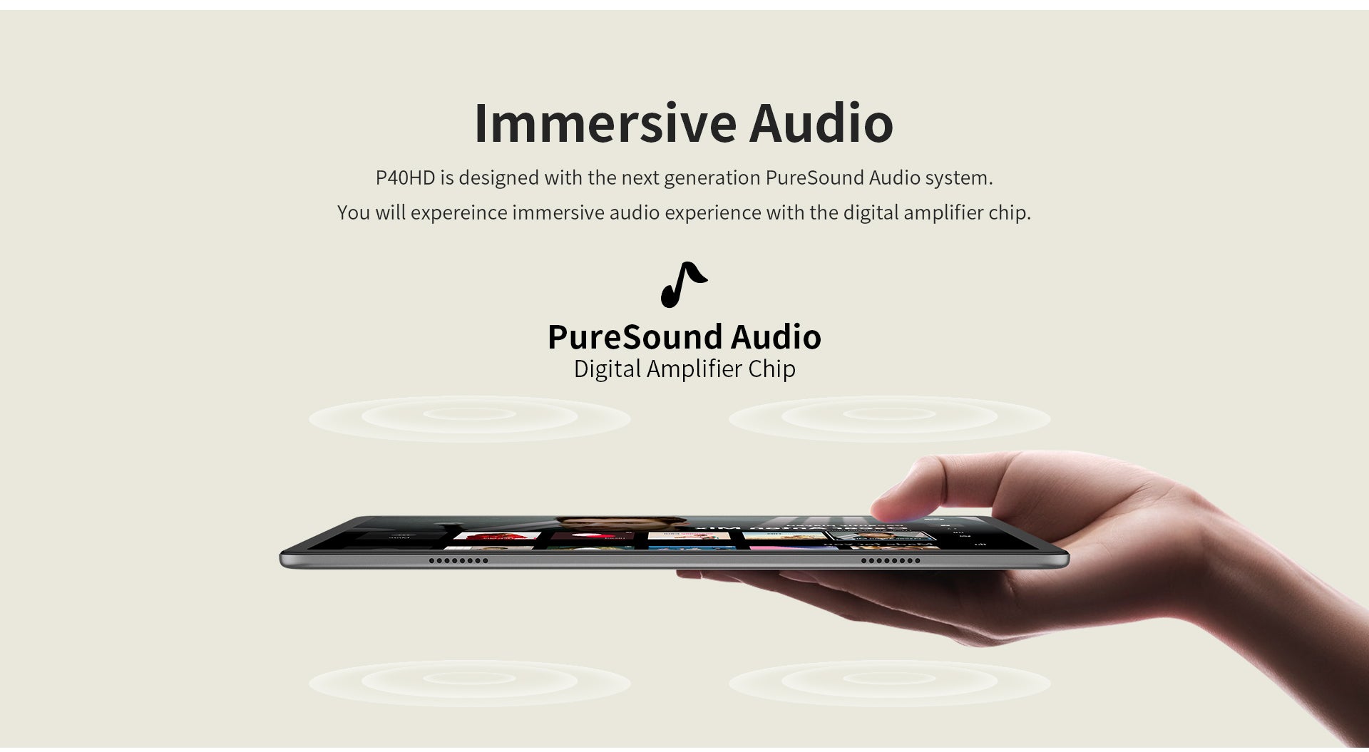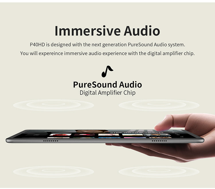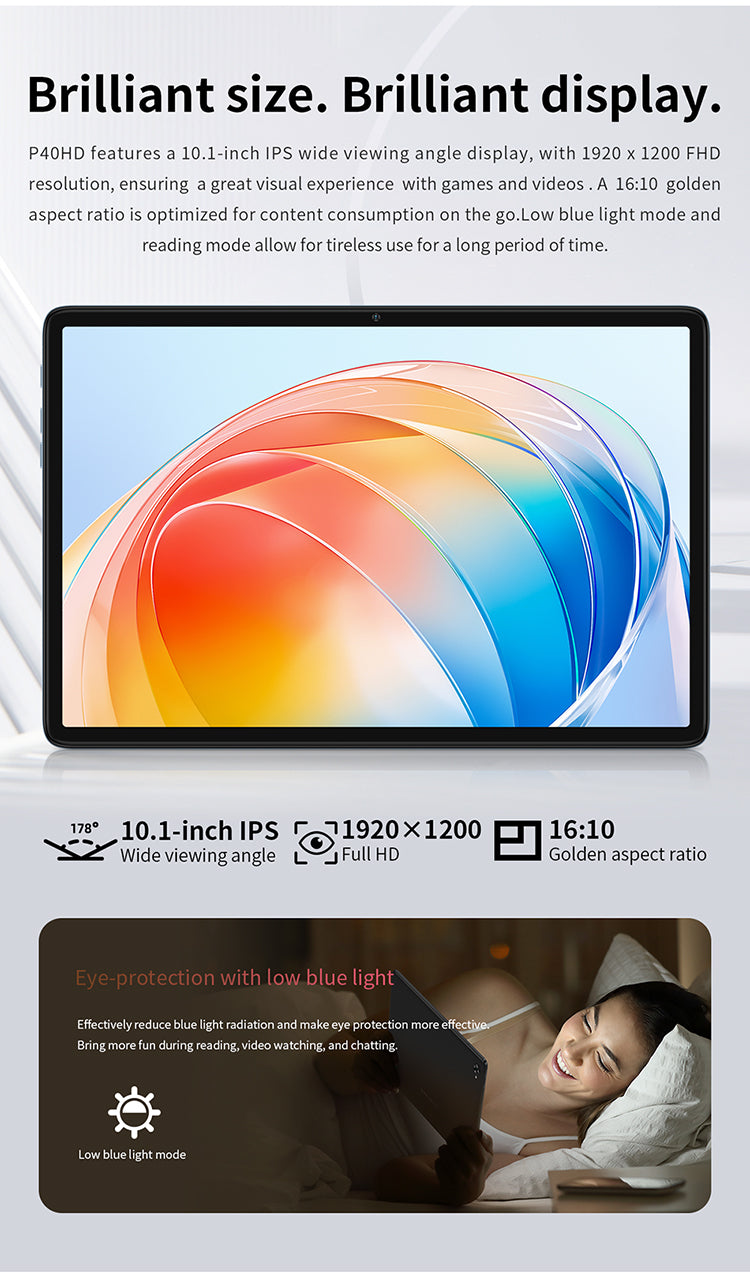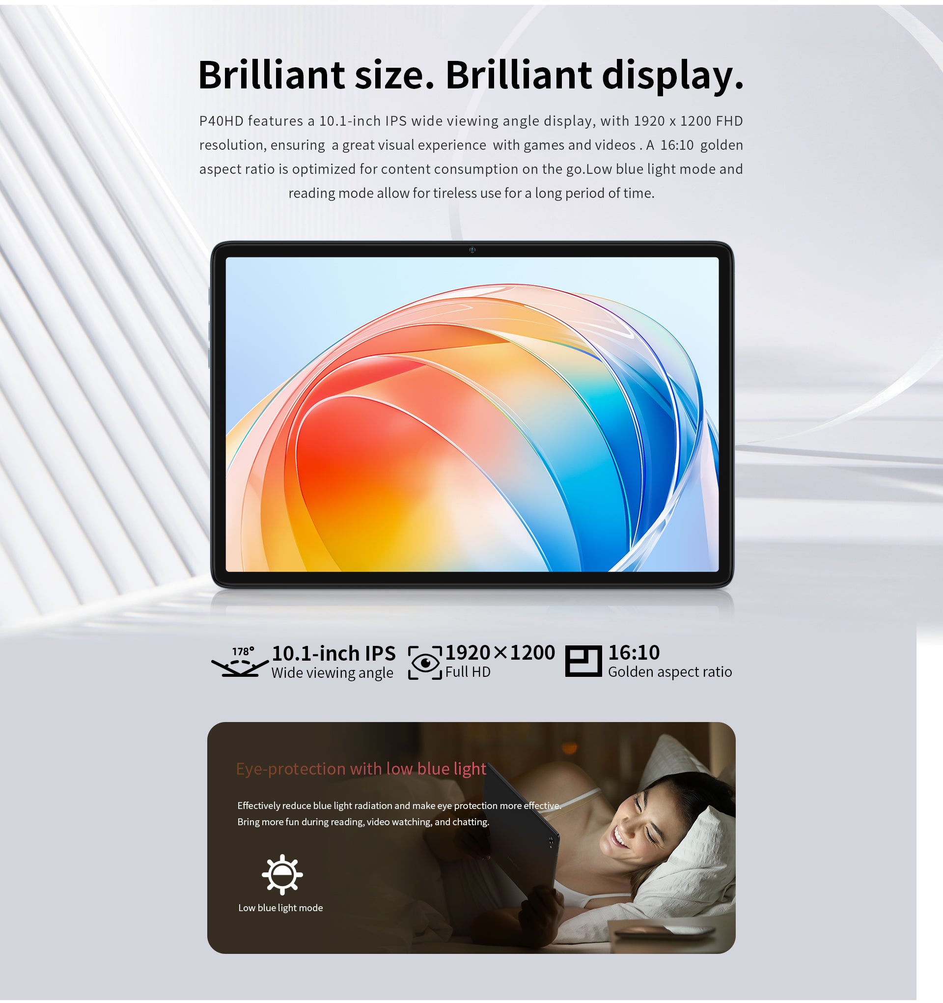 [Brilliant display, Brilliant size] P40HD features a 10.1-inch IPS wide viewing angle display, with 1920X1200 HD resolution, ensuring a great visual experience with games and videos. A 16:10 golden aspect ratio is optimized for content consumption on the go.