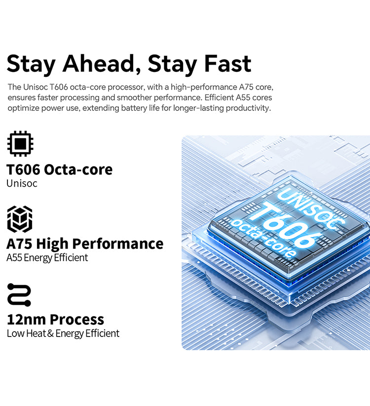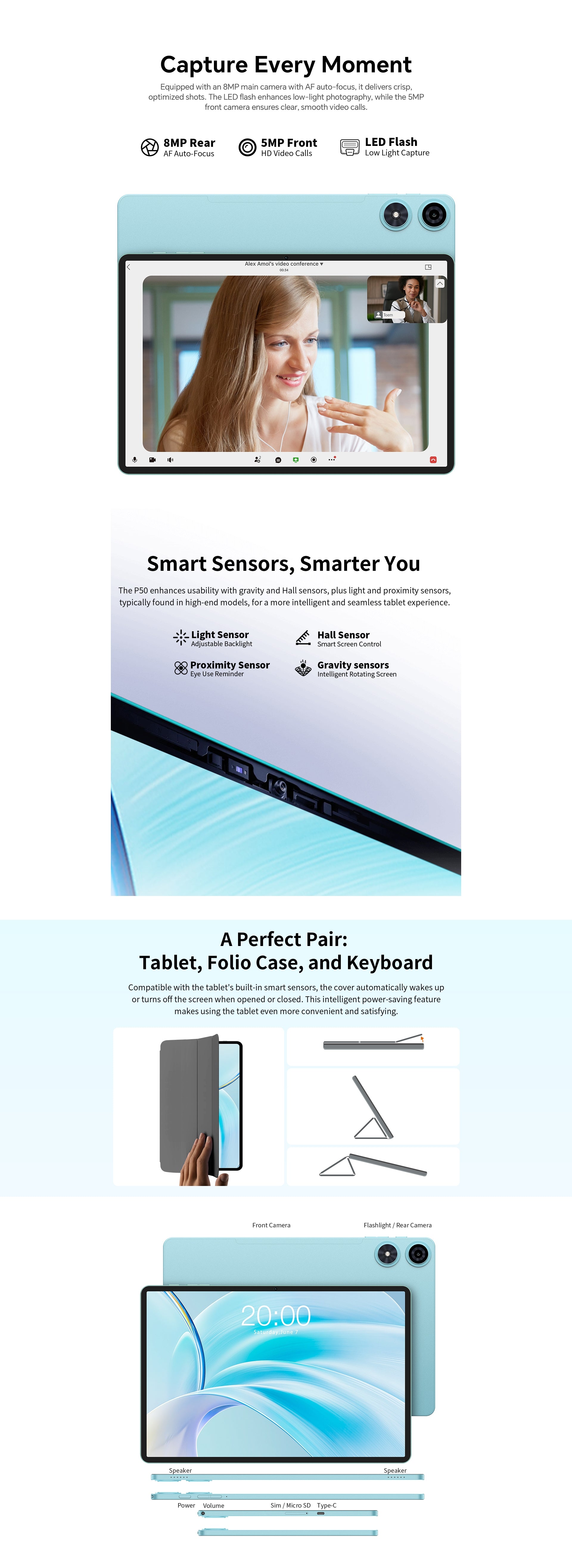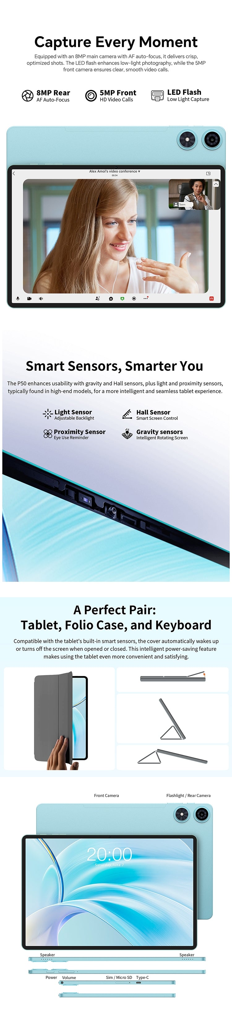 [Powerful Performance] Powered by the Unisoc T606 Octa-Core processor and Mali-G57 GPU, the P50 2025 handles up to 20GB RAM (8GB base with 12GB expansion) and 128GB storage, delivering fast multitasking performance and ample storage for apps, media, and more.