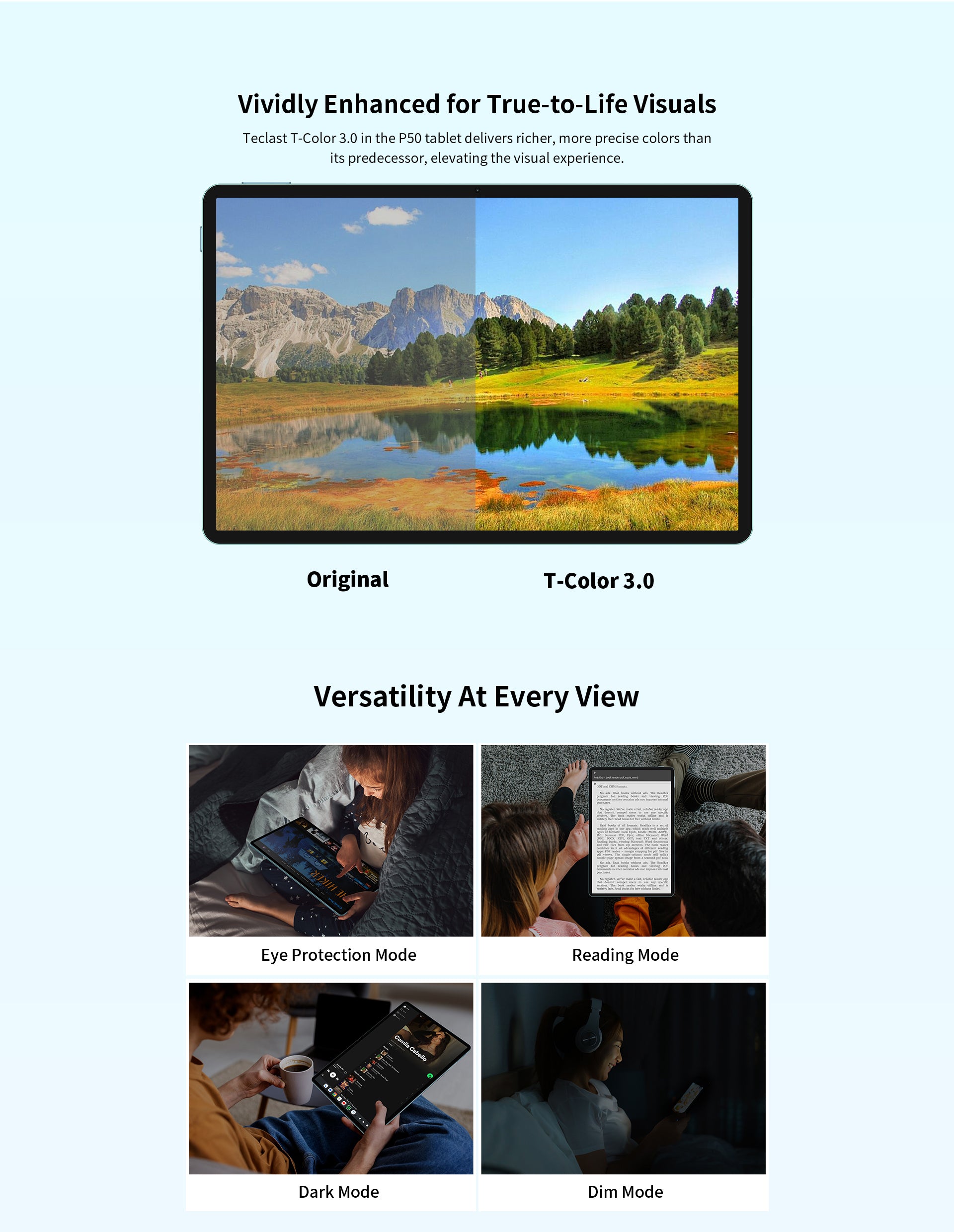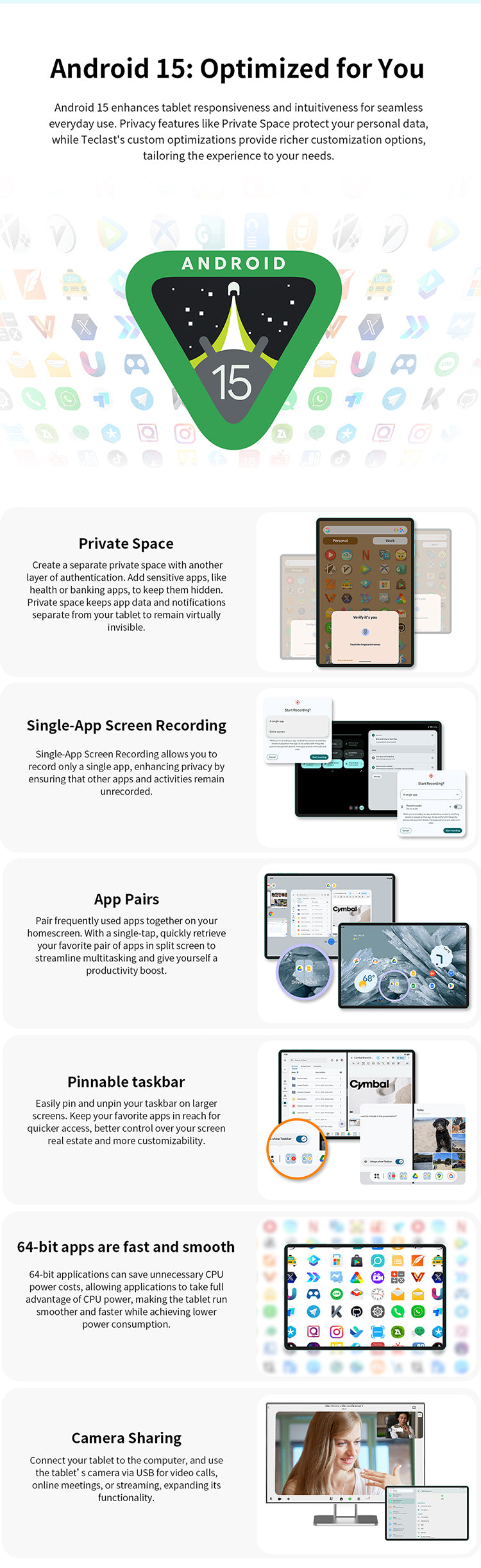 [Optimized Android 15] Android 15 brings all-new AI capabilities, making the P50 2025 tablet more responsive and intuitive in everyday use. Teclast's custom optimizations offer a richer array of customization for an enhanced experience.