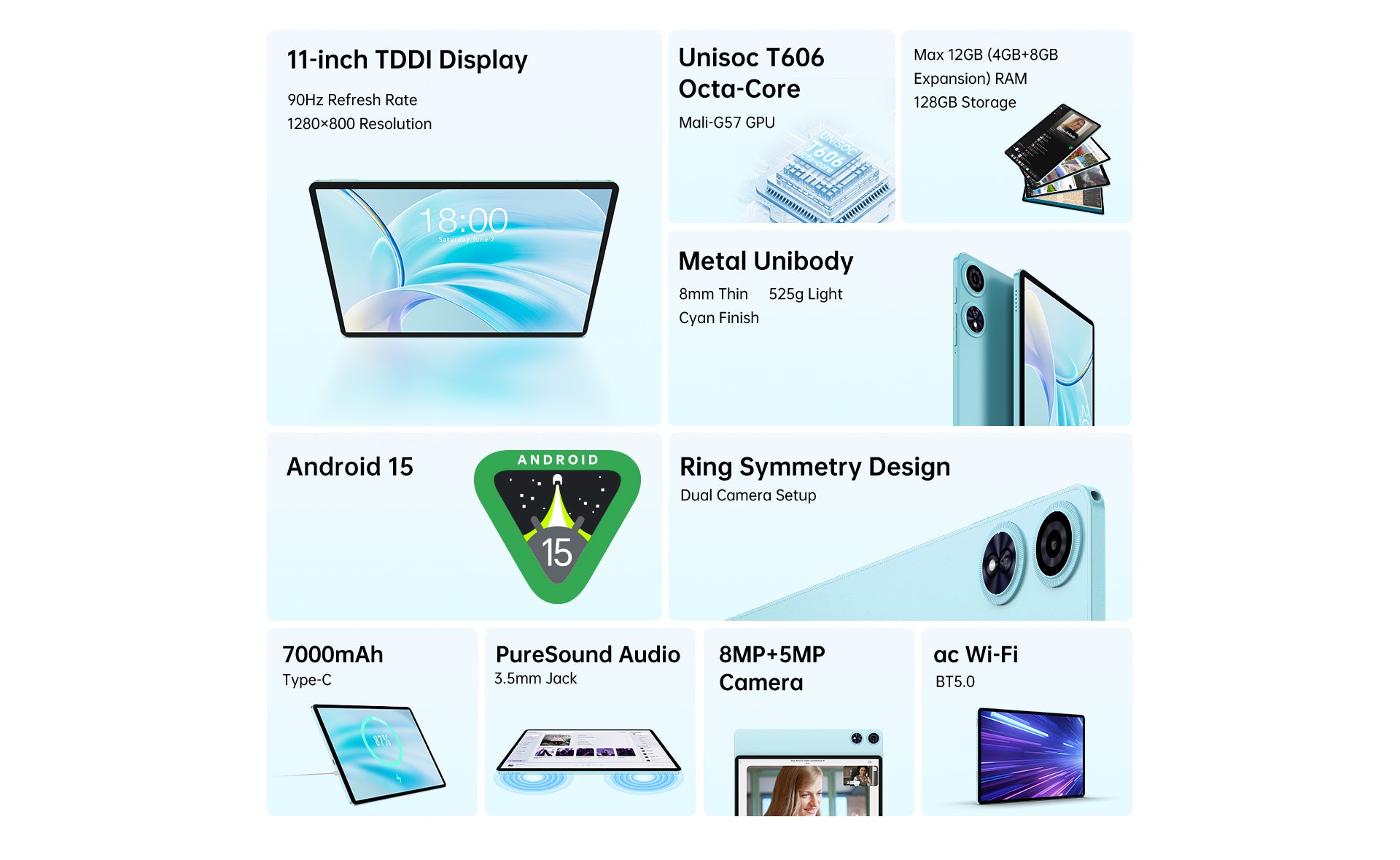 [High-Performance Computing] Powered by a Unisoc T606 Octa-Core processor and Mali-G57 GPU, this tablet is capable of handling up to 12GB RAM (4GB base plus 8GB expansion) and offers 128GB storage for efficient multitasking and ample storage space.