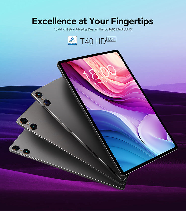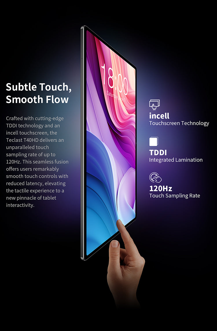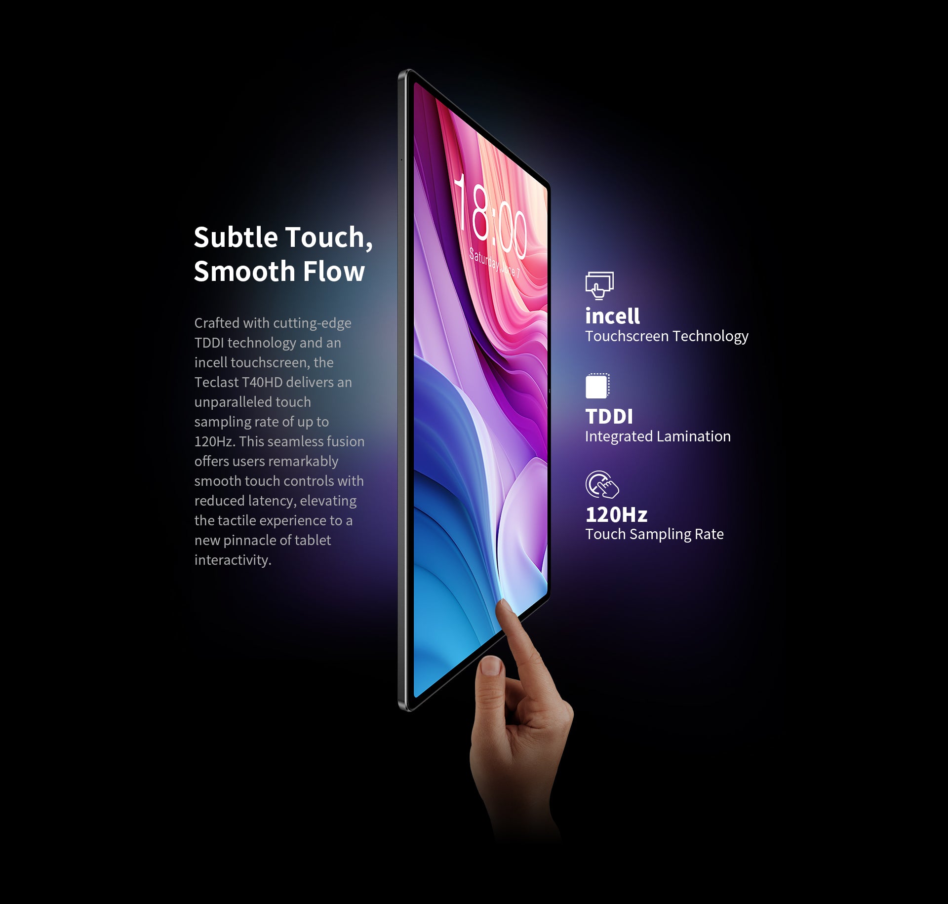 [Vivid 2K Display] Teclast T40HD boasts a 10.4-inch 2K rounded full-screen display, complemented by a slim 7.5mm symmetrical bezel. With TDDI technology and T-Color 3.0 optimization, you are in for a viewing experience that's more vivid and realistic than ever before.