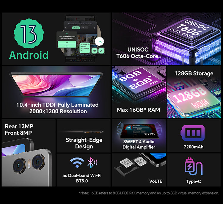 [Powerful Octa Core Processor] Teclast T40HD is powered by a UNISOC Tiger T606 processor and goes all out with up to 16GB RAM (8GB+8GB RAM Expansion) and 128GB storage with up to 1TB Micro SD card expansion.