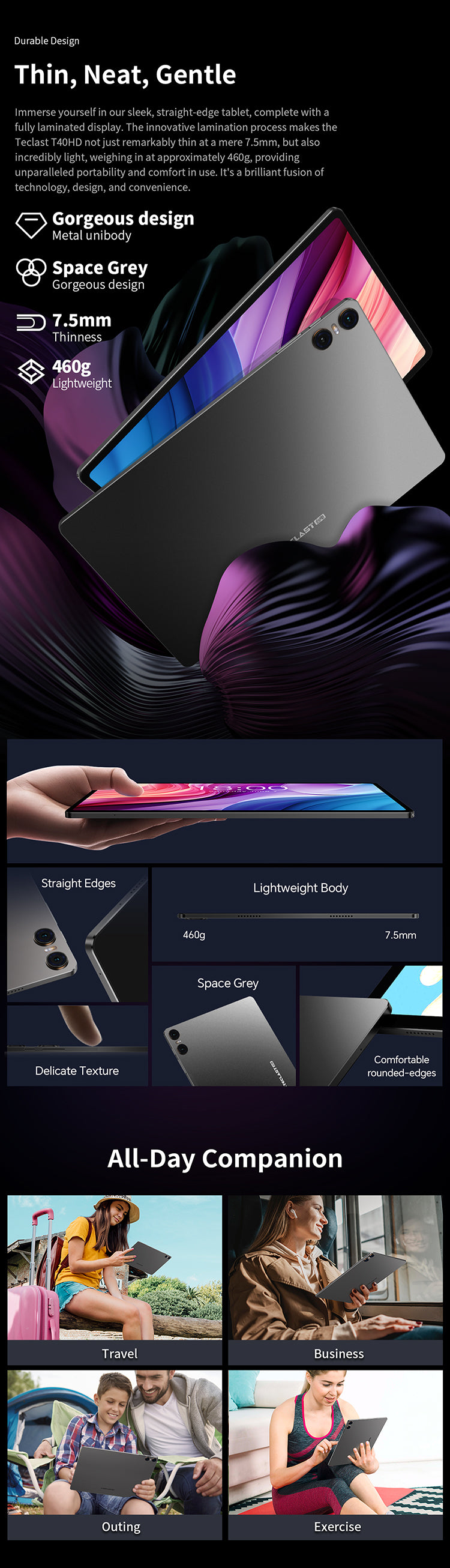 [Delicate Straight Edges] Teclast T40HD features a next-generation straight-edge metal body, crafted for a sleek profile. Its slim 7.5mm thickness is further accentuated by an attractive sandblasting finish.