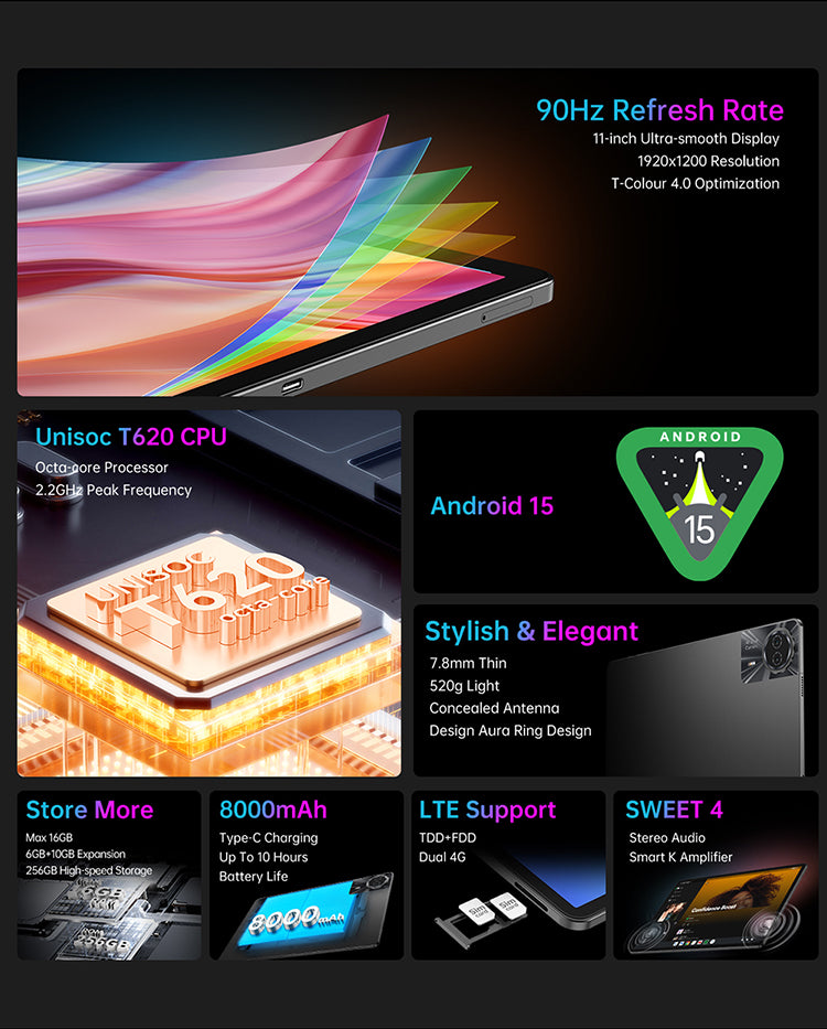 [Lightweight Durability] Designed for mobility, the Teclast T50 Plus weighs just 520g and has a slim 7.8mm profile. Its CNC-machined aluminum body with a sandblasted finish offers robust durability without compromising on style, making it the perfect companion for on-the-go use.