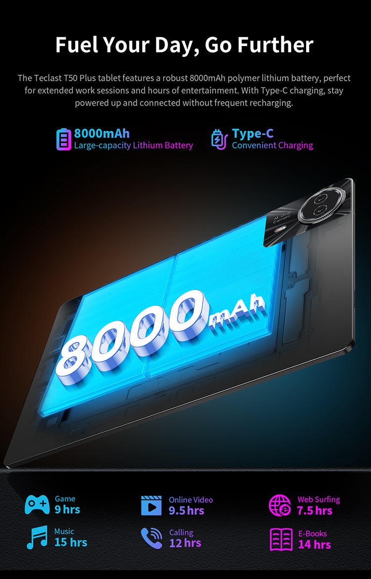 [All-Day Battery Life] Stay powered up with the 8000mAh battery, providing up to 10 hours of usage for all-day productivity.