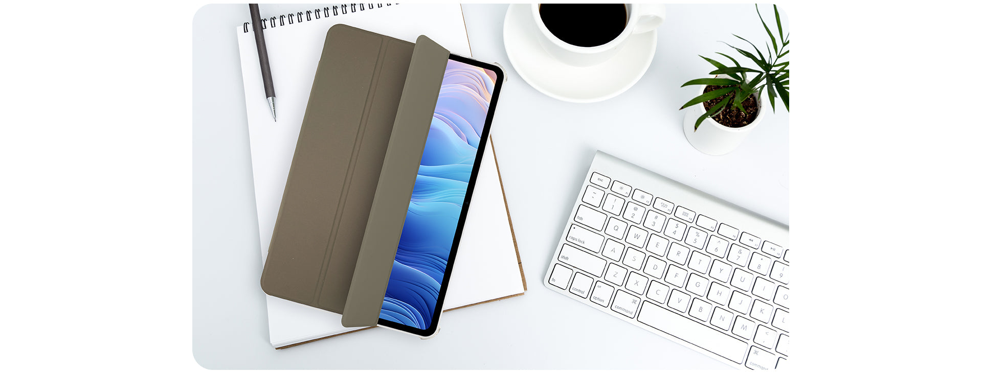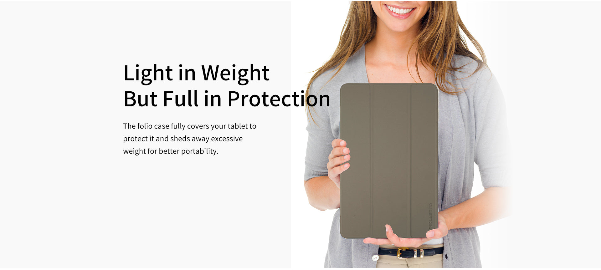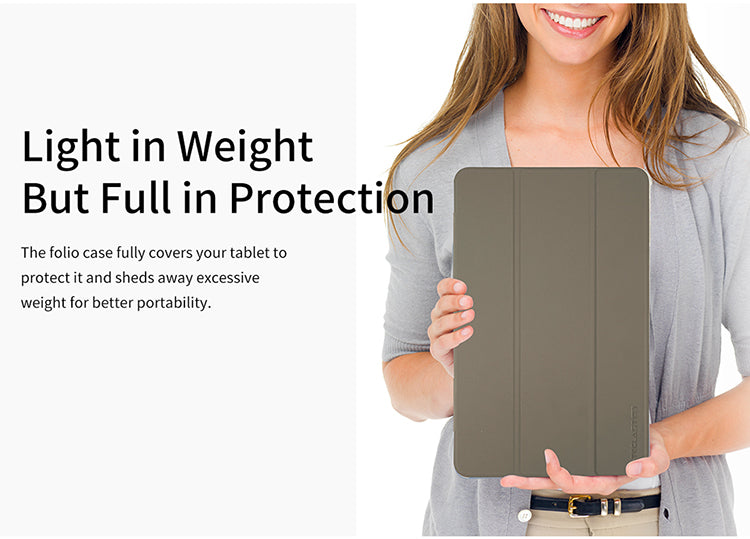 The folio case fully covers your tablet to protect it and sheds away excessive weight for better portability.
