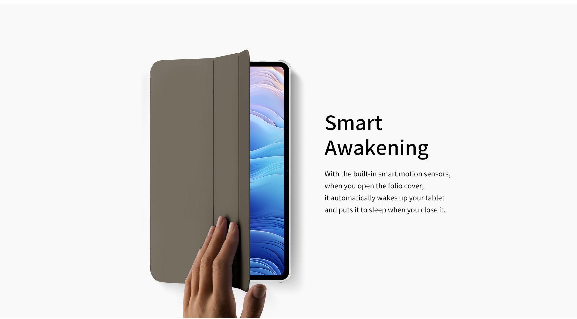 With the built-in smart motion sensors, when you open the folio cover, it automatically wakes up your tablet and puts it to sleep when you close it.