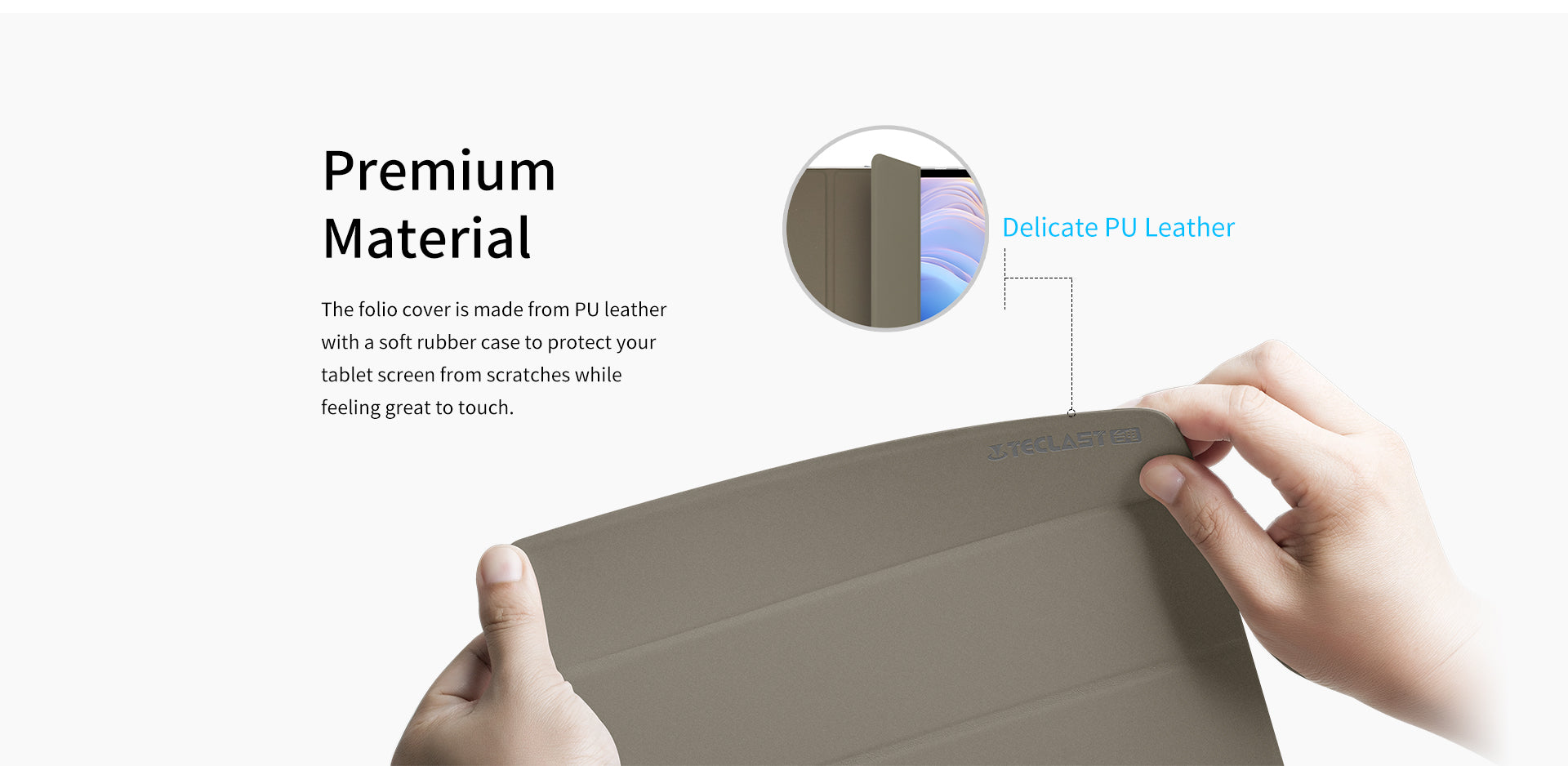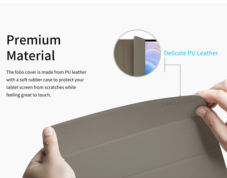 The folio cover is made from PU leather with a soft rubber case to protect your tablet screen from scratches while feeling great to the touch.