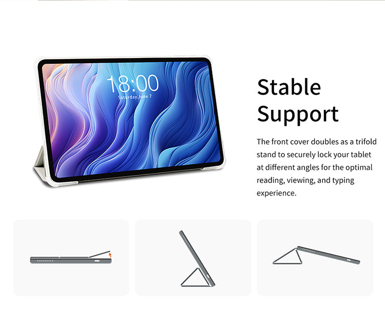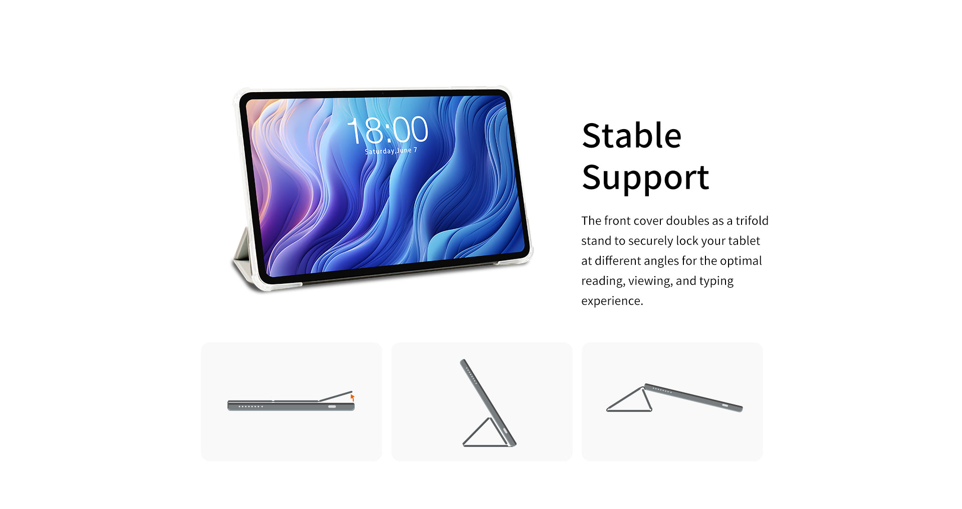 The front cover can be used as a trifold stand to securely lock your tablet at different angles for the optimal reading, viewing, and typing experience.
