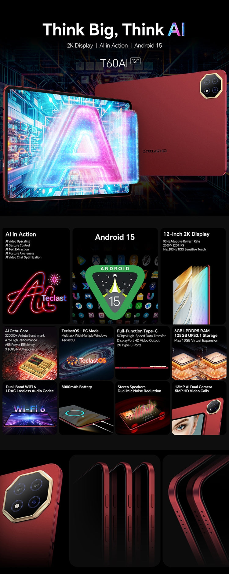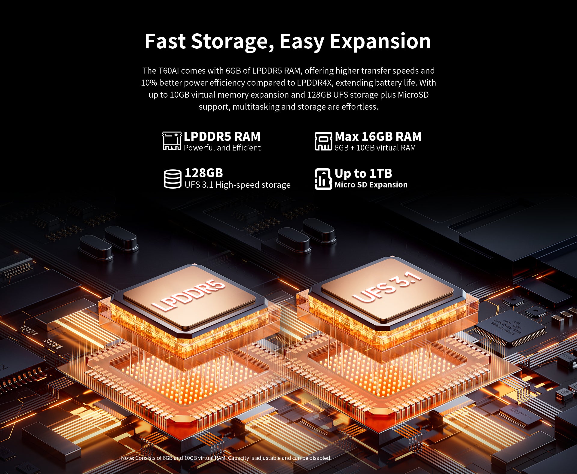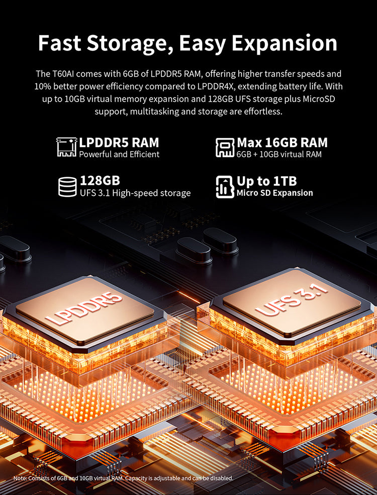 [Memory and Storage] With up to 16GB RAM (6GB LPDDR5 + 10GB virtual) and 128GB UFS 3.1 storage, the T60AI ensures fast access to data and ample space for apps and media, supporting efficient multitasking.