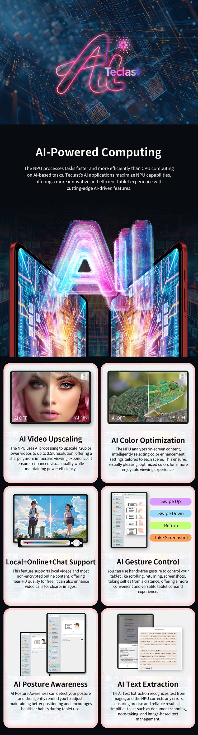 [AI in Action] Unlock a smarter tablet experience with AI-driven functionalities: Video Upscaling for enhanced visuals, Gesture Control for touchless interaction, Text Extraction for efficient text recognition, and Posture Awareness to promote healthier usage.