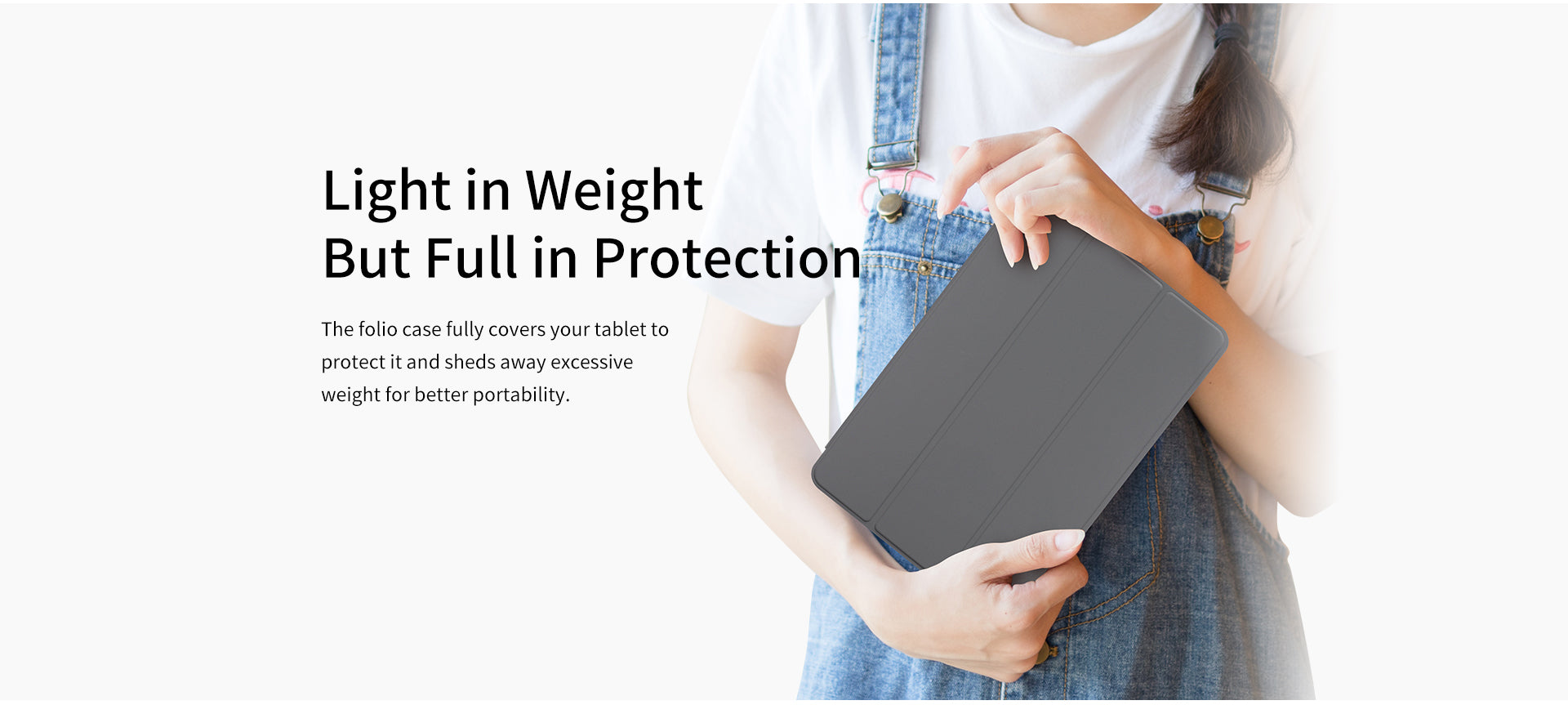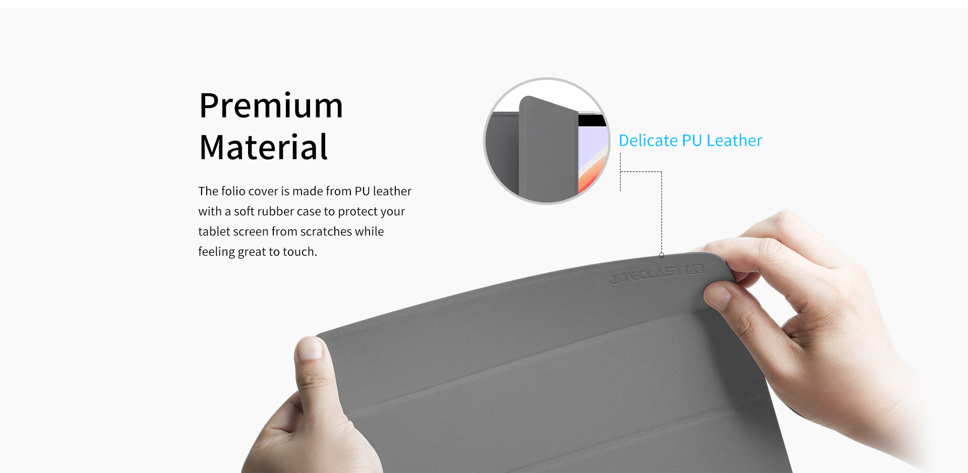 A capa do fólio é feita de couro PU com uma capa de borracha macia para proteger a tela do seu tablet contra arranhões enquanto se sente bem ao toque.