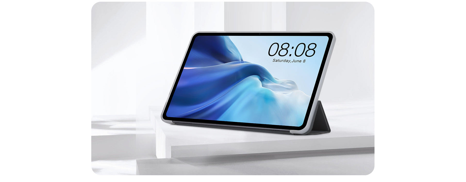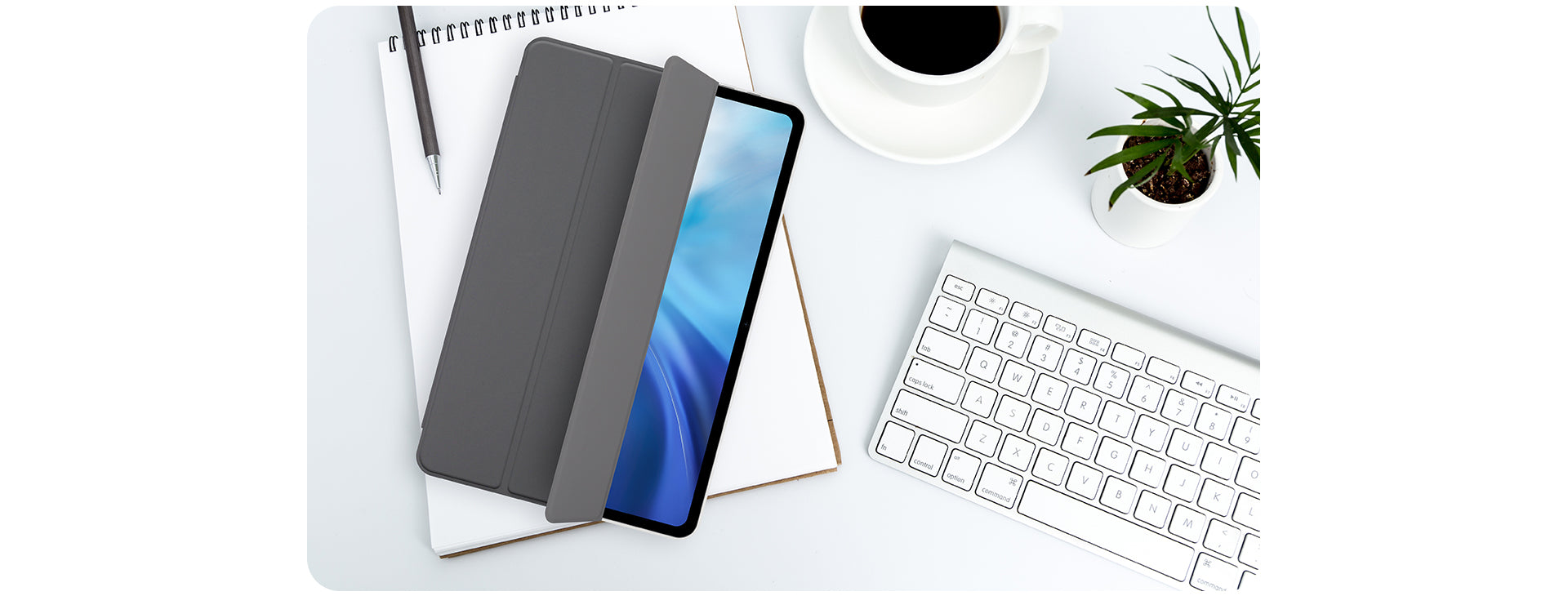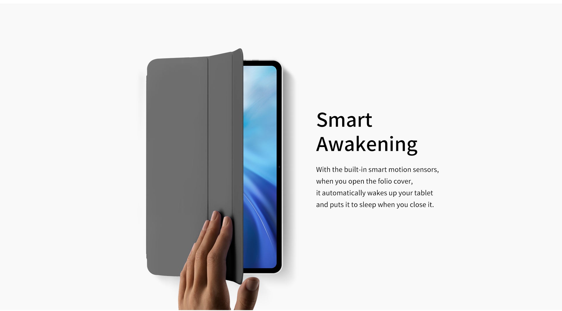 Com os sensores de movimento inteligentes integrados, quando você abre a capa do fólio, ele ativa automaticamente o tablet e o coloca em repouso quando você o fecha.