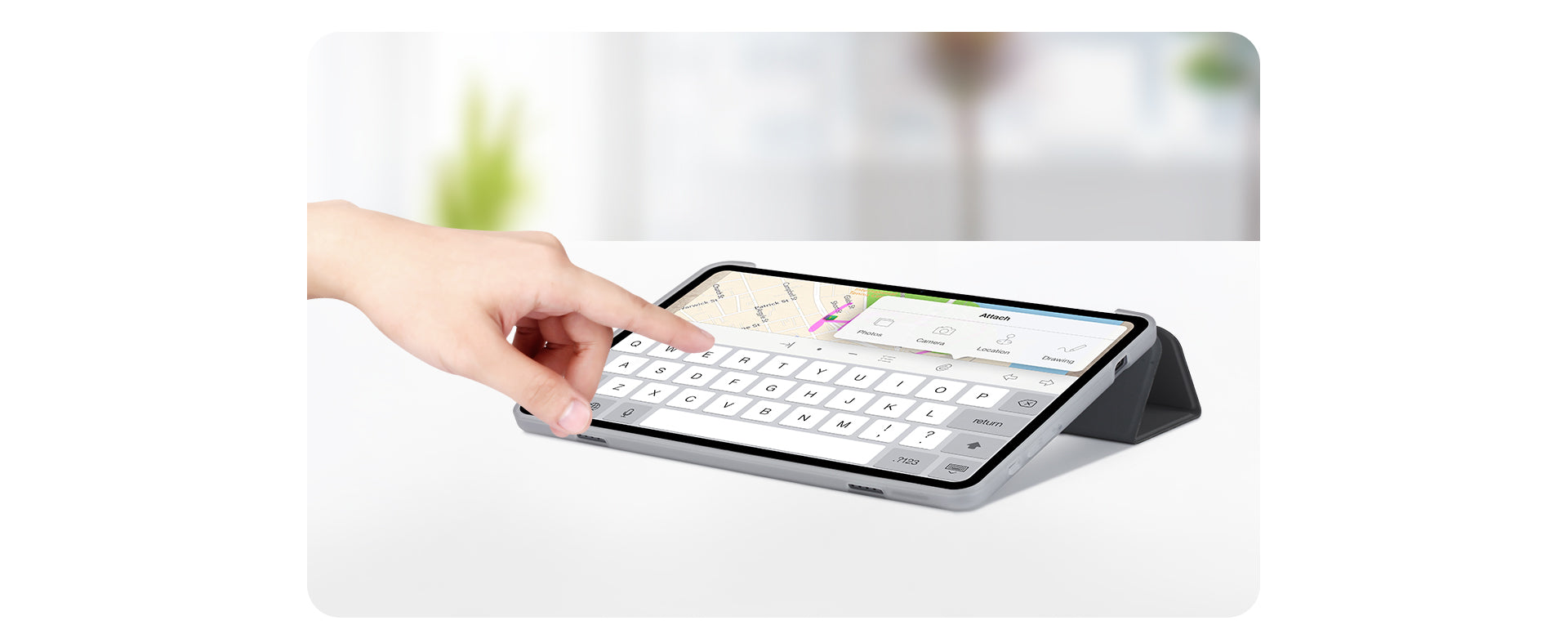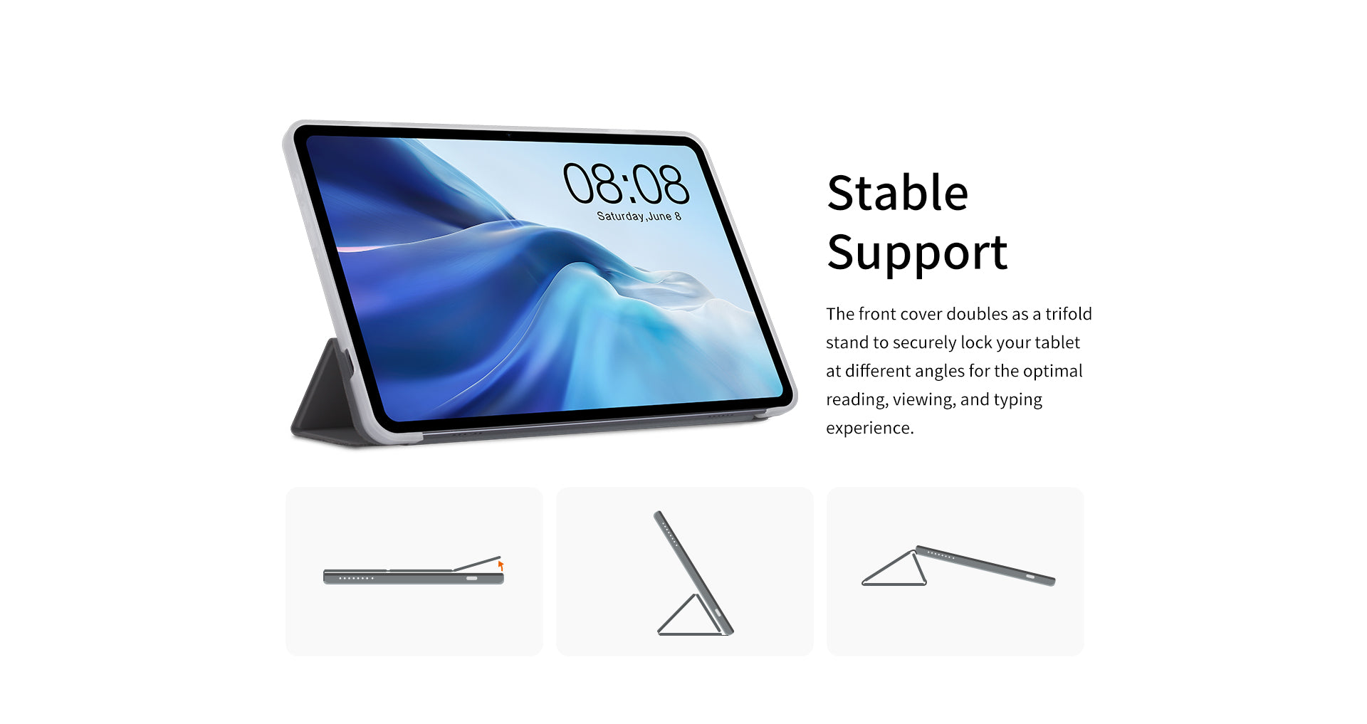 A tampa frontal pode ser usada como um suporte triplo para travar seu tablet com segurança em diferentes ângulos para uma ótima experiência de leitura, visualização e digitação .
