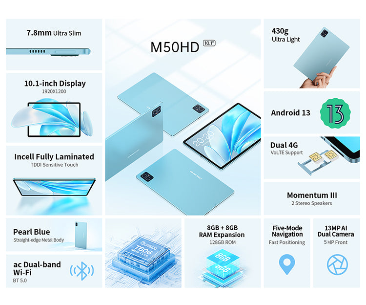 [Pearl Blue Design] Sporting a 'Pearl Blue' hue, the M50HD has a sleek 7.8mm profile and weighs a mere 435g. Its compact and feather-light form makes it convenient to carry, so you're ready to work or play on the move.