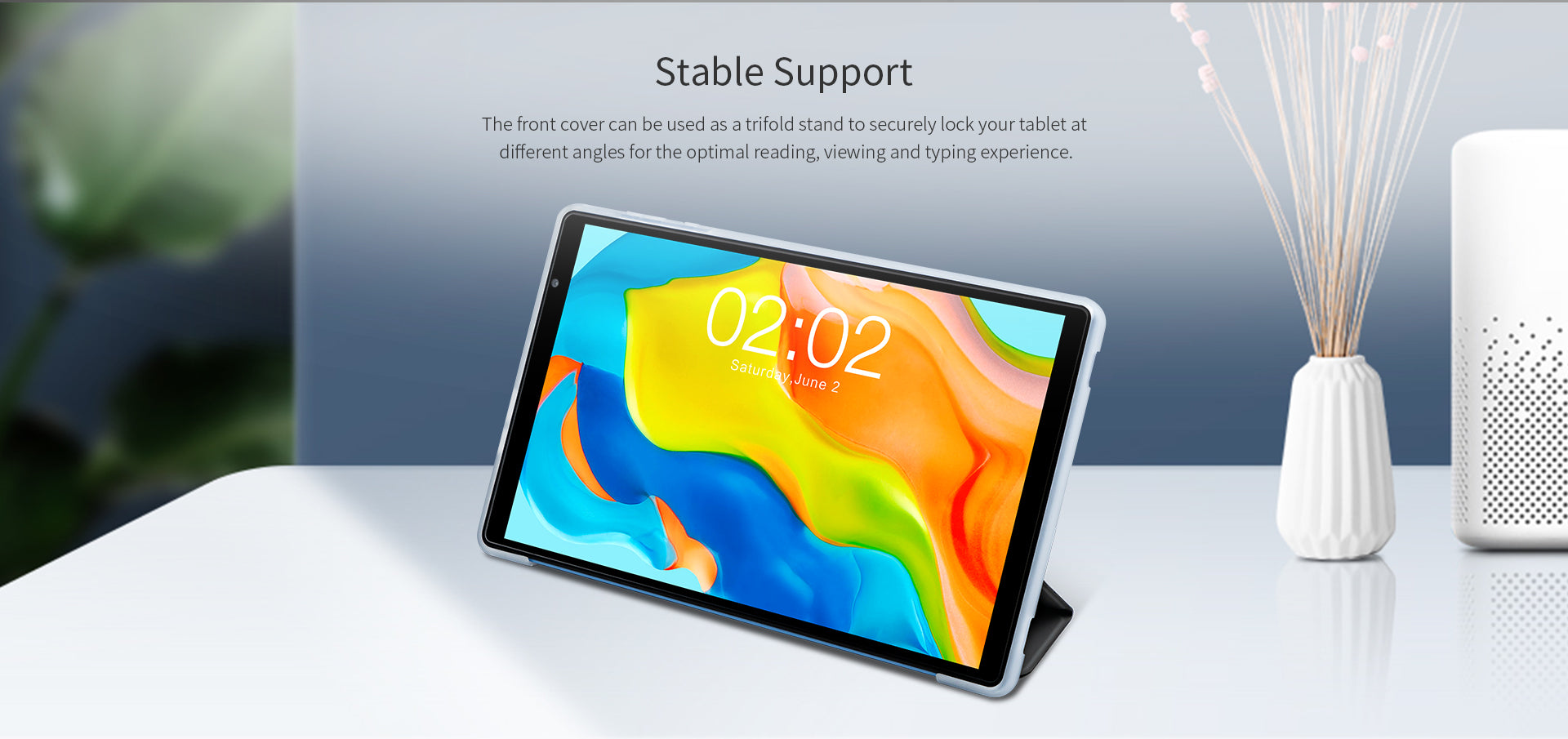 A capa frontal pode ser usada como um suporte com três dobras para travar com segurança seu tablet em diferentes ângulos para leitura, visualização e visualização ideais. experiência de digitação.