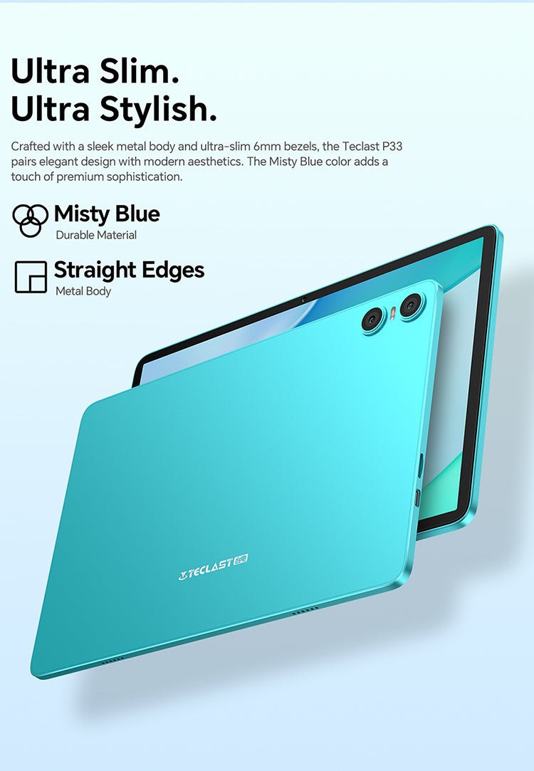 [Casual Daily Design] With a misty blue body, the P33 tablet boasts a sleek, attractive appearance and remains durable enough for everyday use.