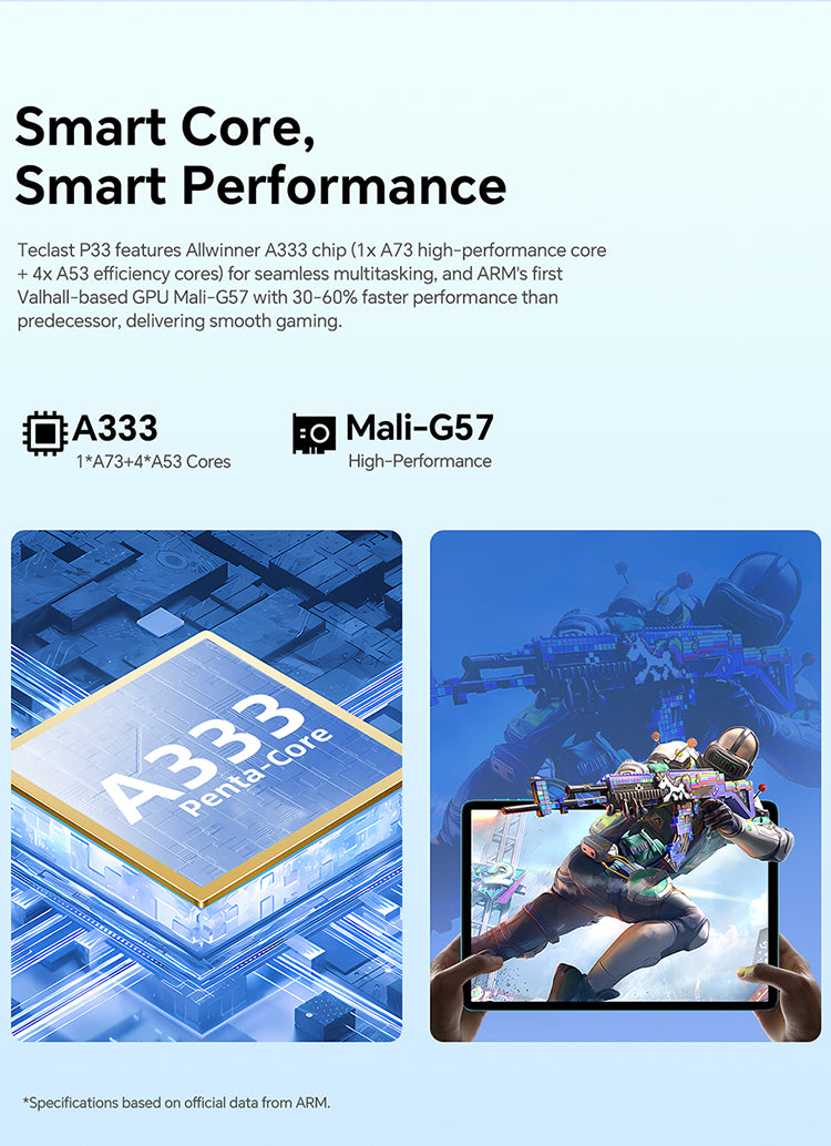 [Smooth Operation] The P33 tablet, powered by the Allwinner A333 CPU, ensures robust performance for seamless multitasking and fluid operation, surpassing previous models in efficiency.