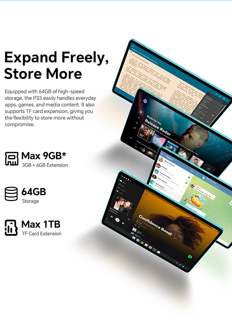 [Practical Storage] The P33 tablet has up to 9GB RAM and 64GB storage (expandable to 1TB via Micro SD), enough for your daily apps and files.