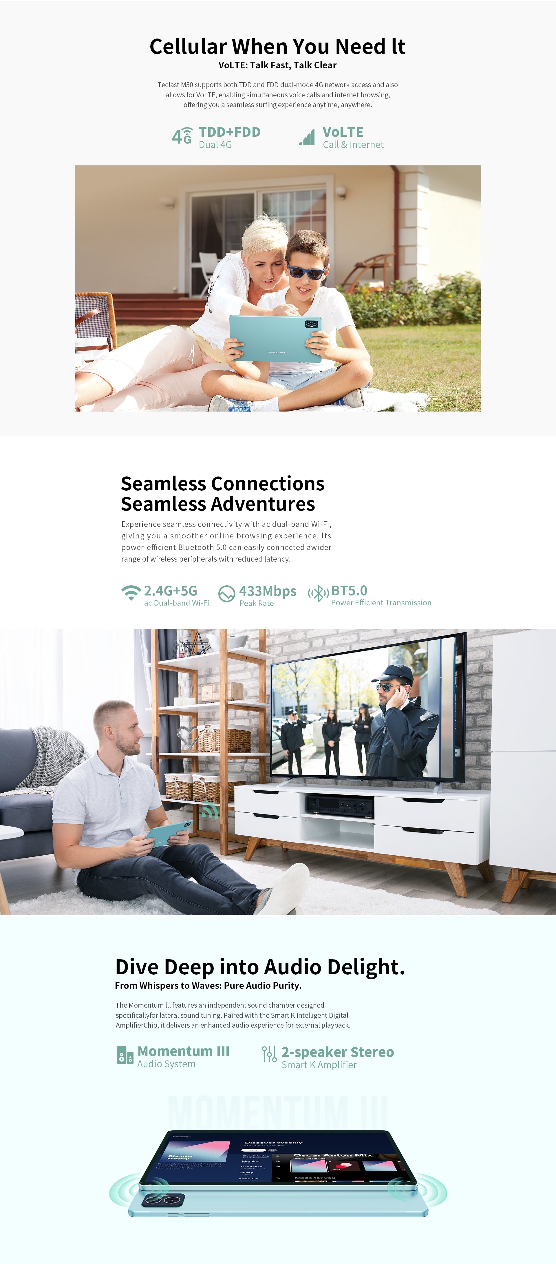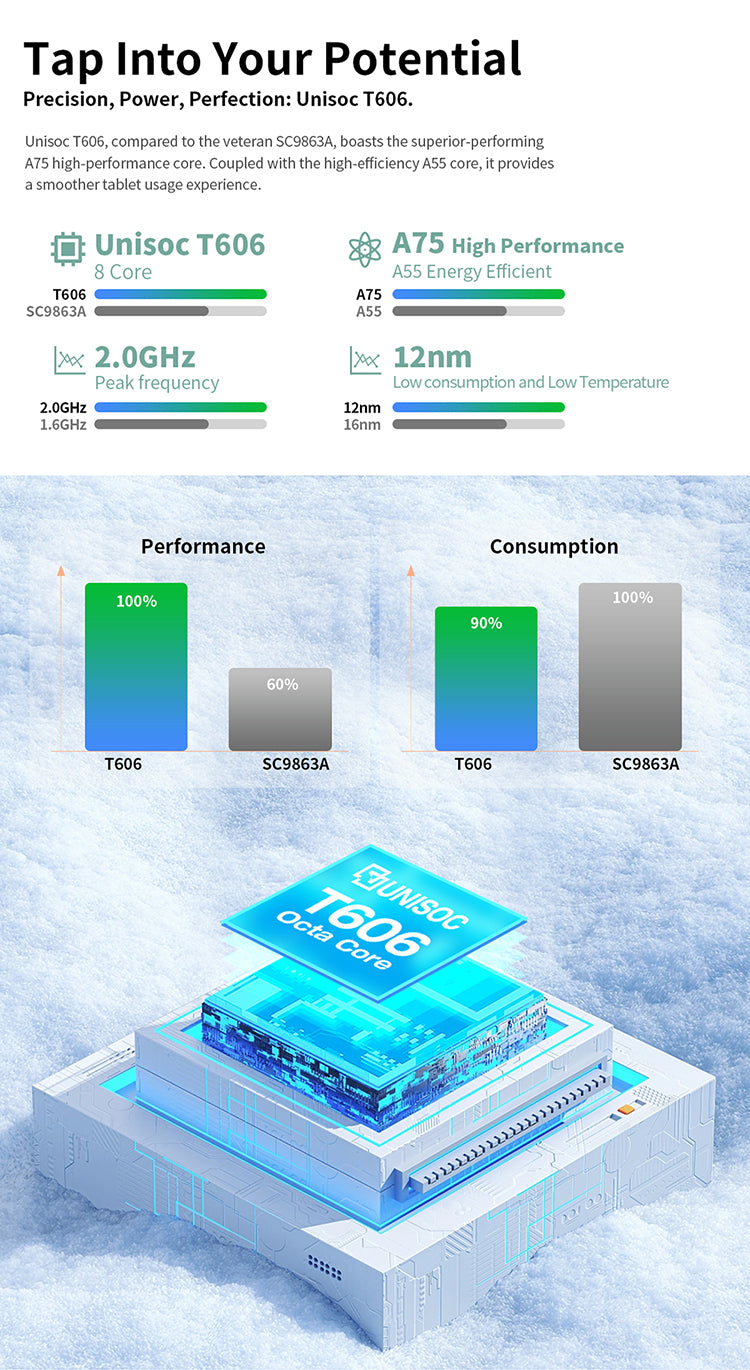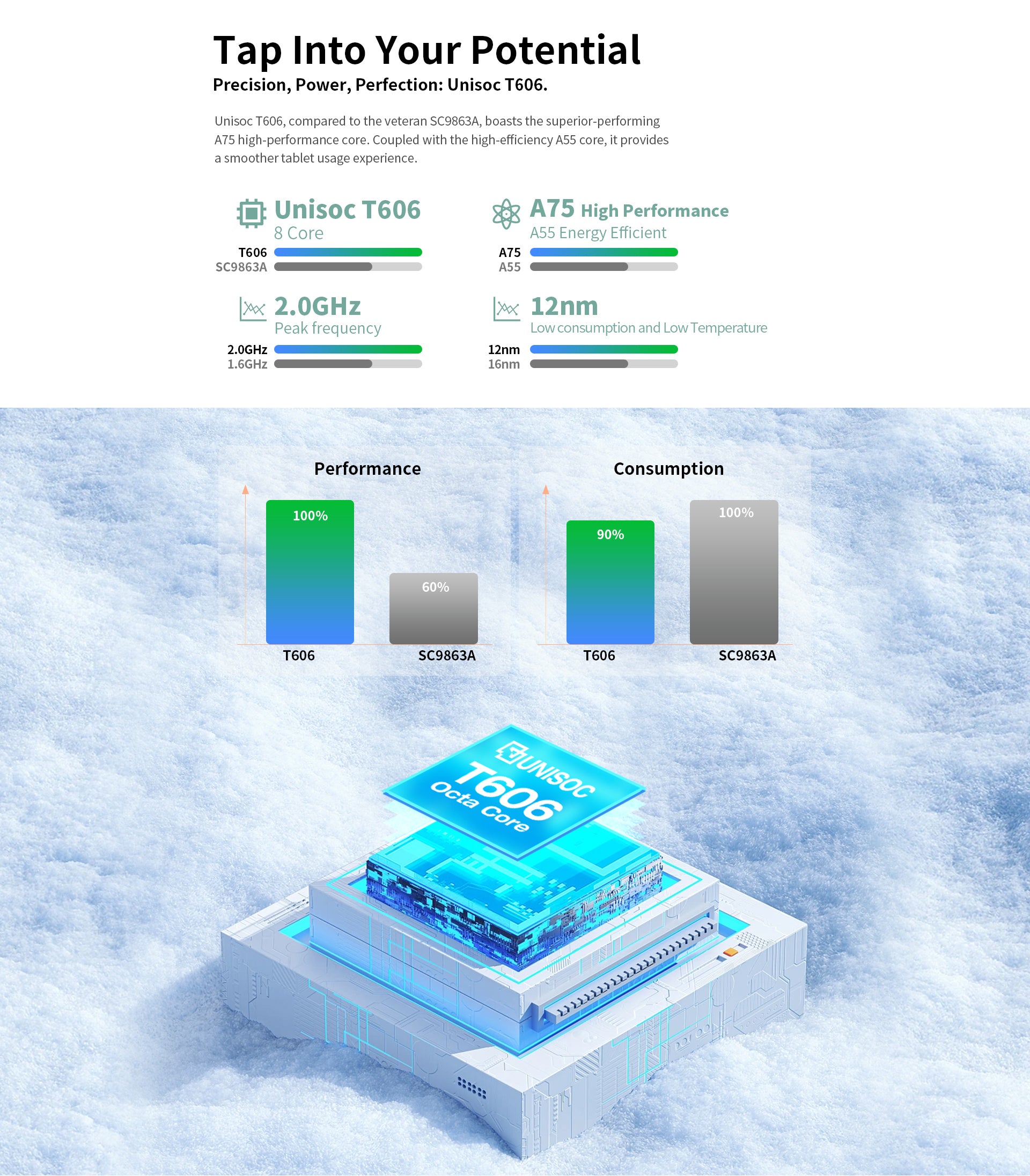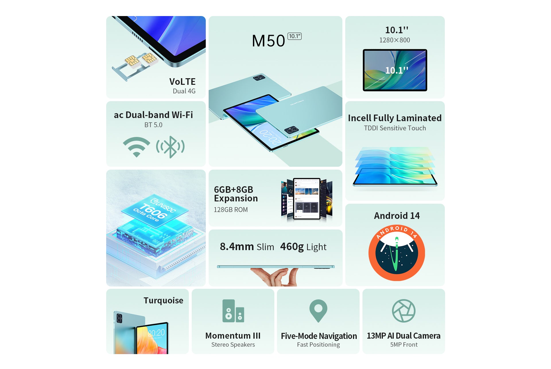 [Надежный процессор] M50 оснащен мощным восьмиядерным процессором T606, обеспечивающим высокую производительность и энергоэффективность. Его графический процессор Mail-G57 усиливает ваше аудиовизуальное удовольствие.