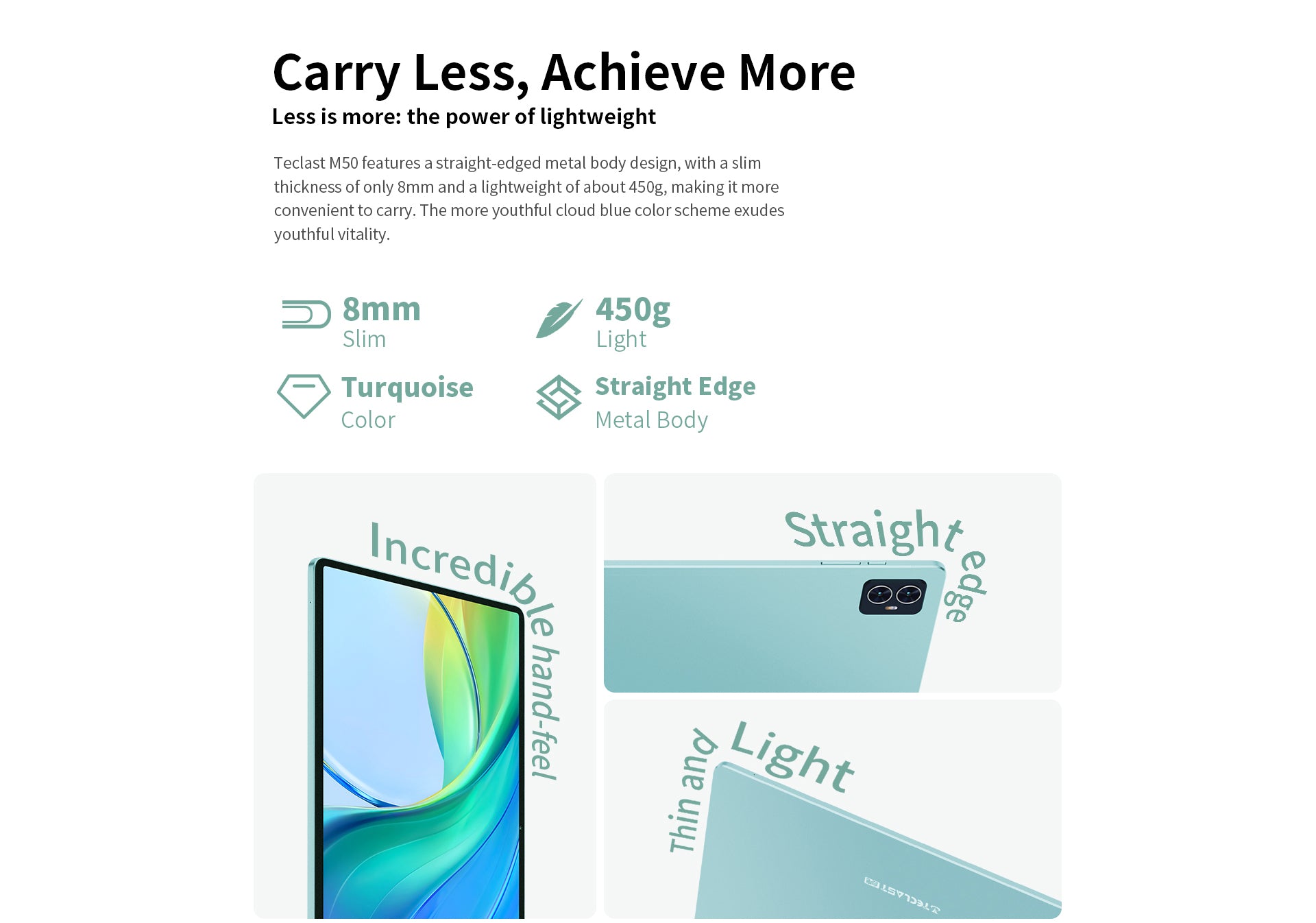 [Изящный бирюзовый дизайн] Обладая «бирюзовым» оттенком, M50 имеет тонкий профиль толщиной 8 мм и весит всего 450 г. Его компактная и легкая форма делает его удобным для переноски, поэтому вы готовы работать или играть в пути.