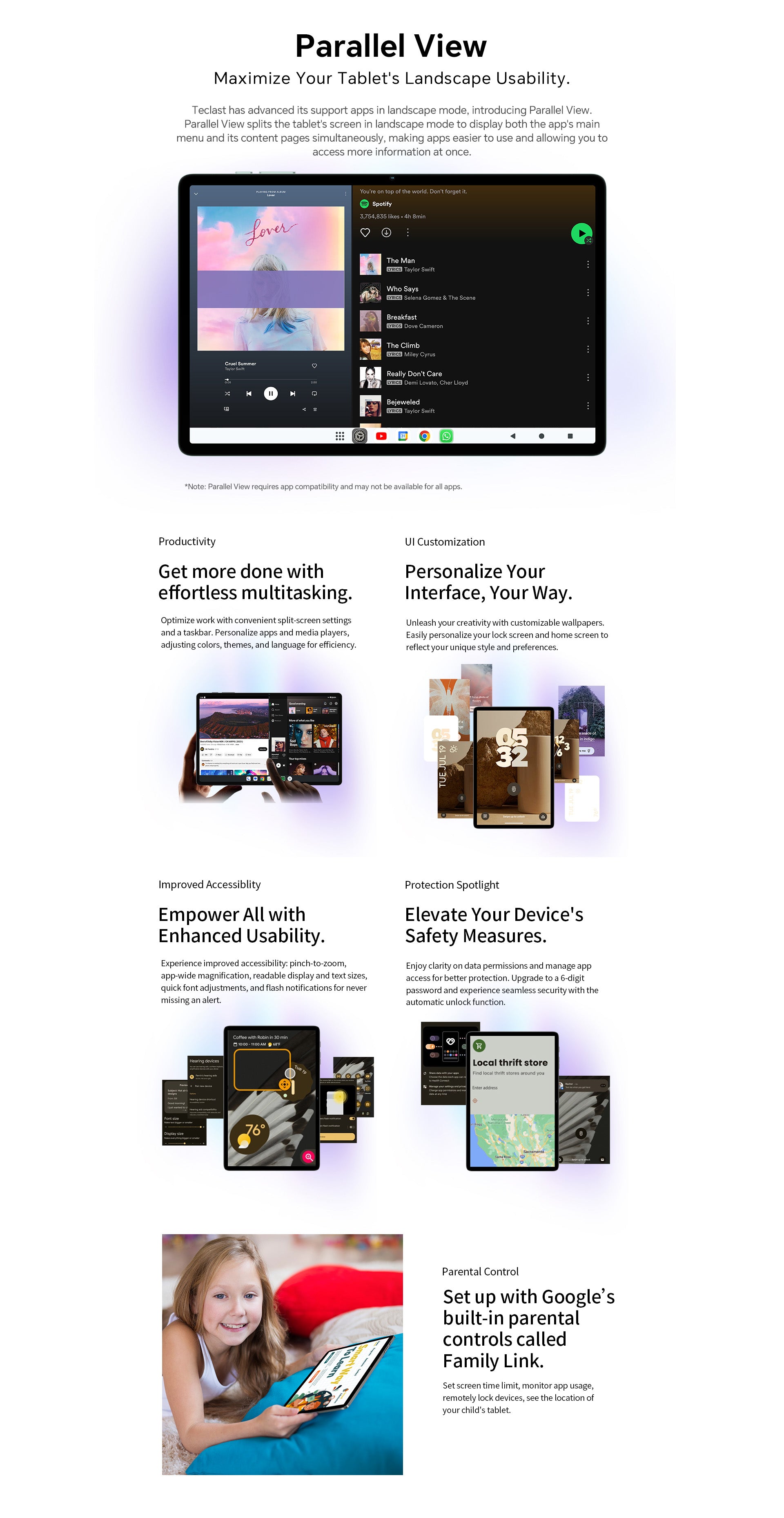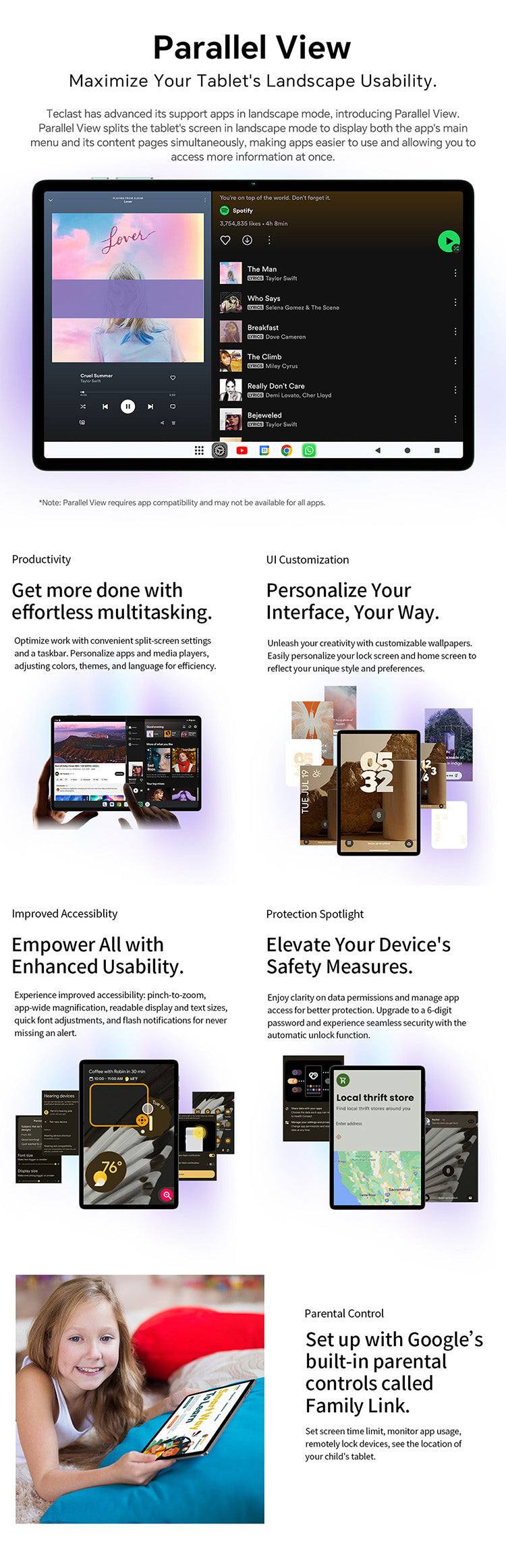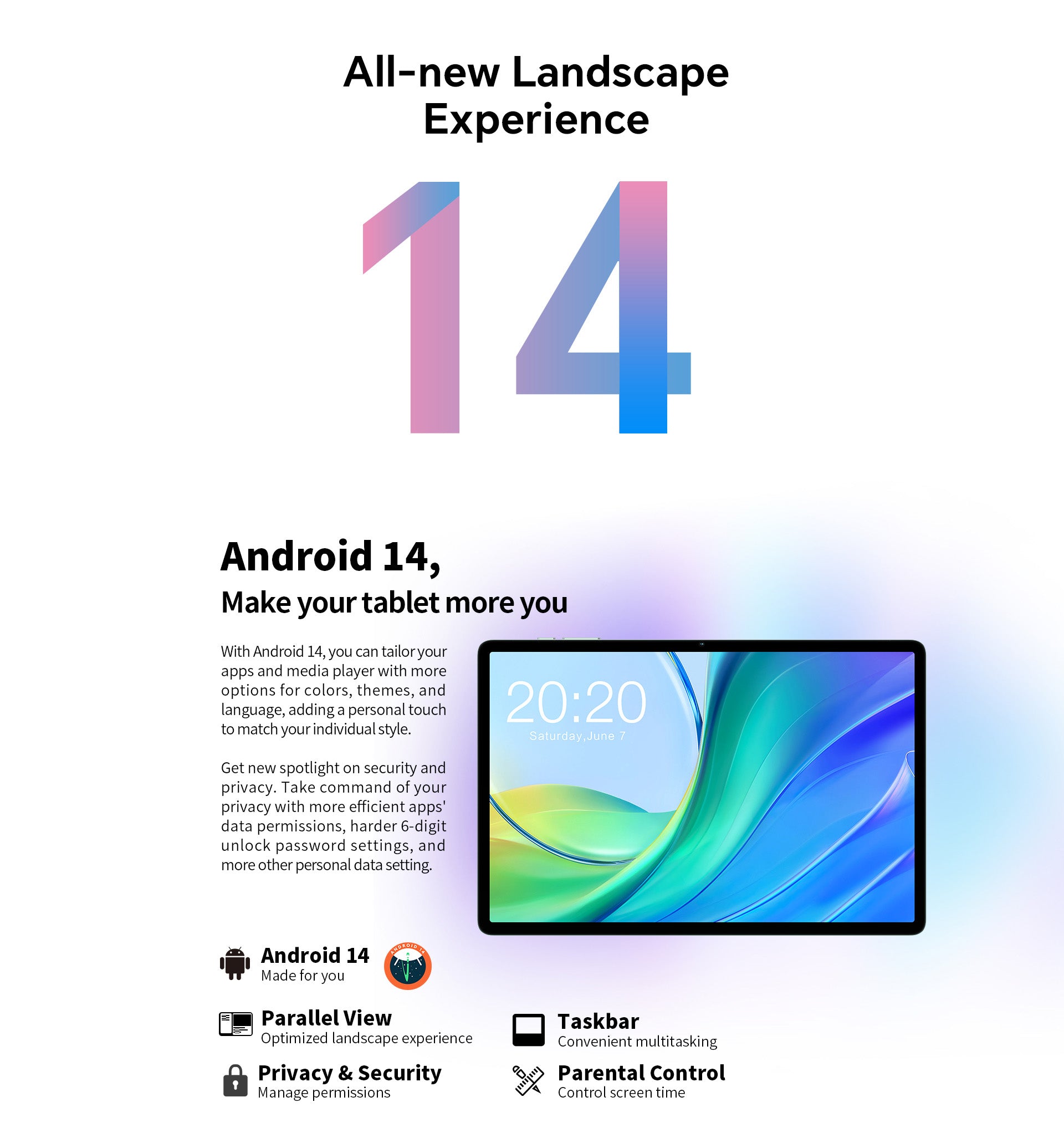 [Расширенный интерфейс Android 14] Благодаря Android 14 M50 обеспечивает горизонтальный параллельный просмотр, удобную панель задач для эффективной многозадачности и надежные параметры родительского контроля для безопасного использования.