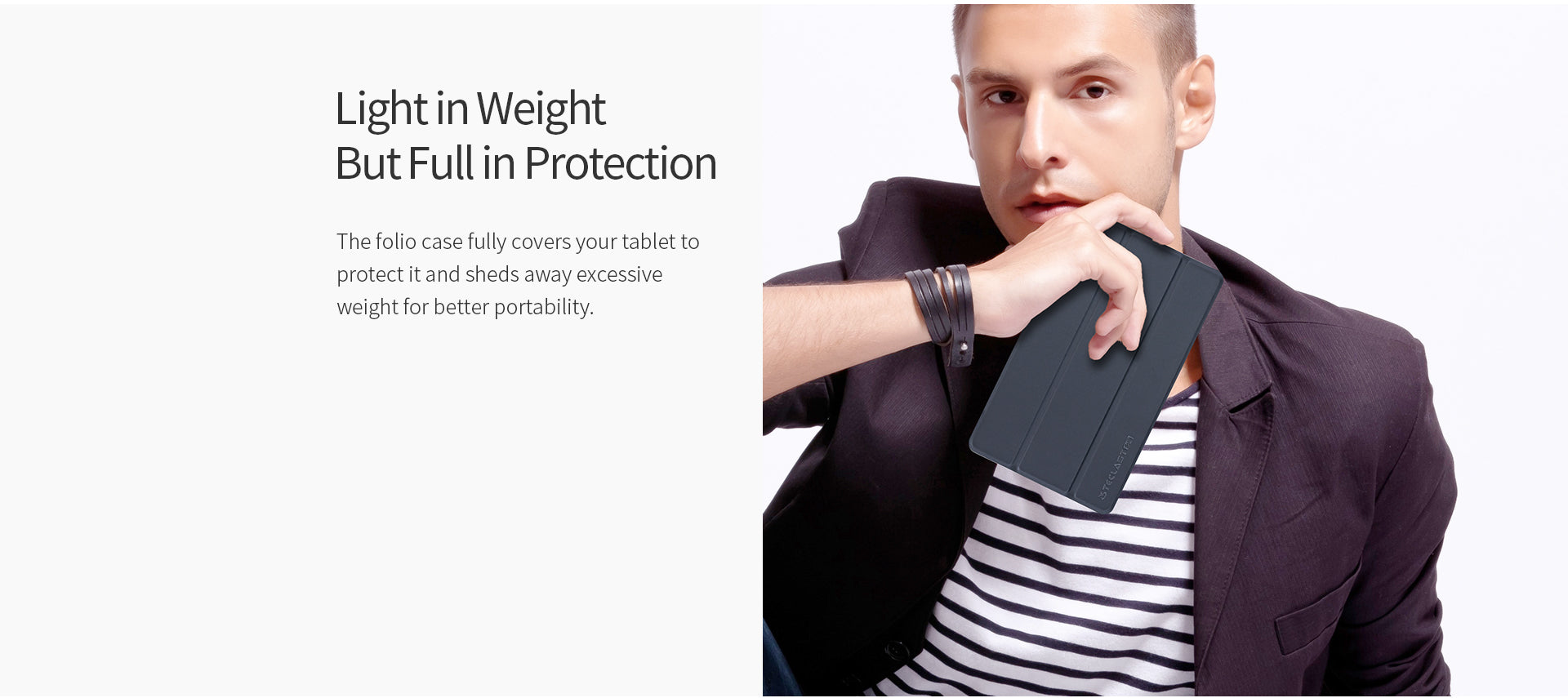 The folio case fully covers your tablet to protect it and sheds away excessive weight for better portability.