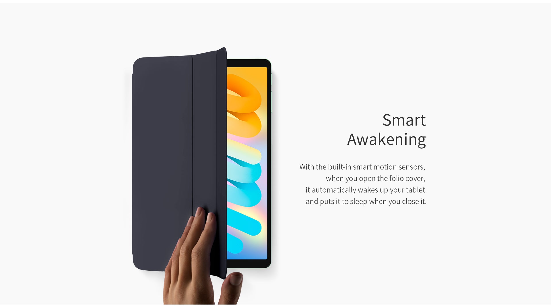 With the built-in smart motion sensors, when you open the folio cover, it automatically wakes up your tablet and puts it to sleep when you close it.