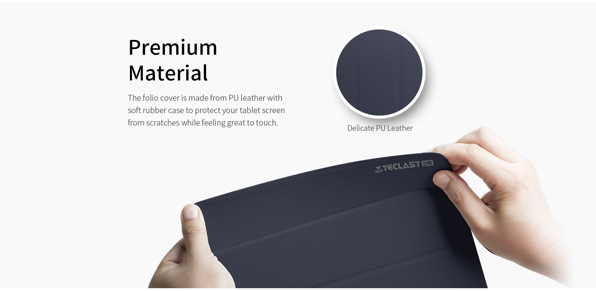 The folio cover is made from PU leather with a soft rubber case to protect your tablet screen from scratches while feeling great to the touch.