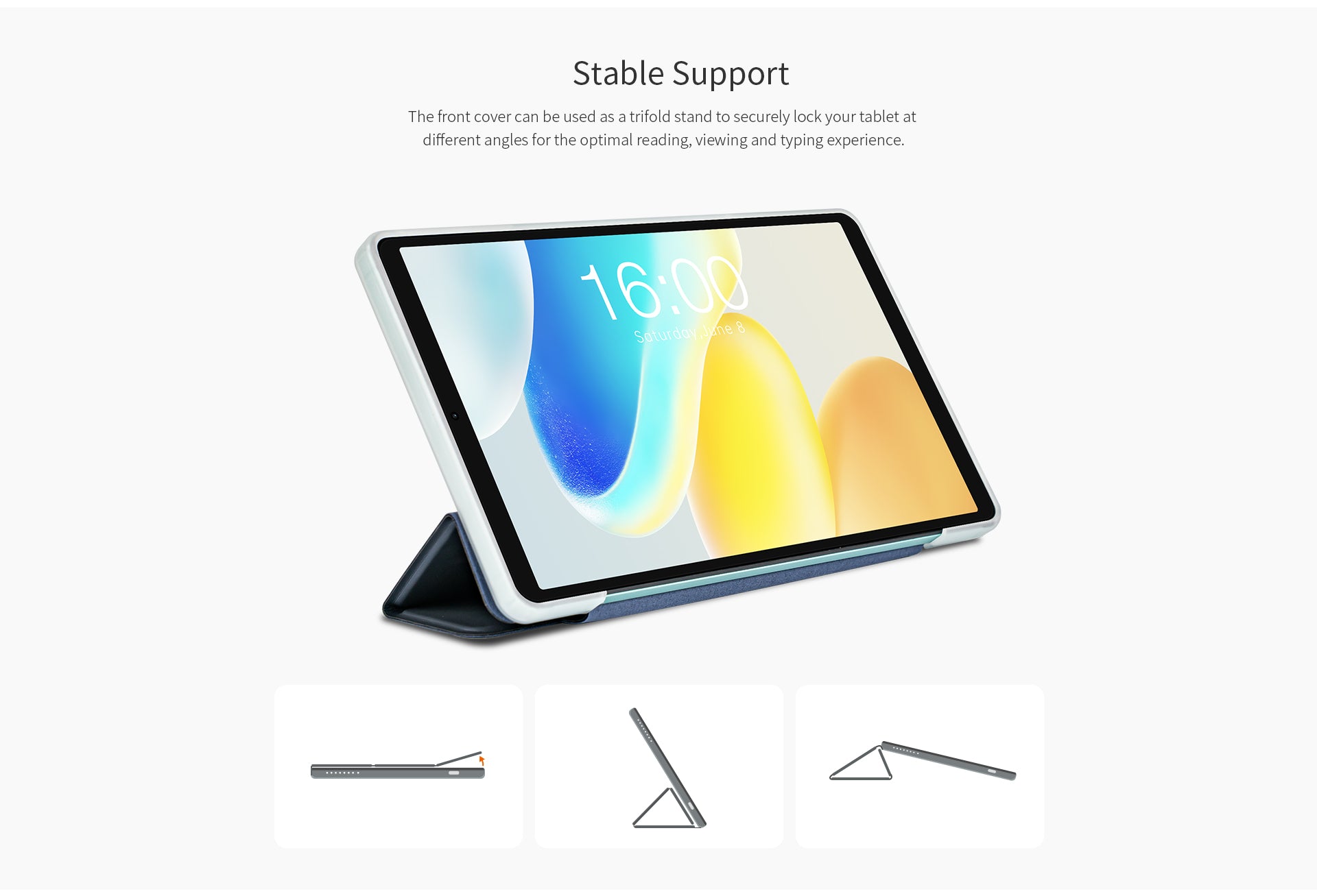 The front cover can be used as a trifold stand to securely lock your tablet at different angles for the optimal reading, viewing, and typing experience.