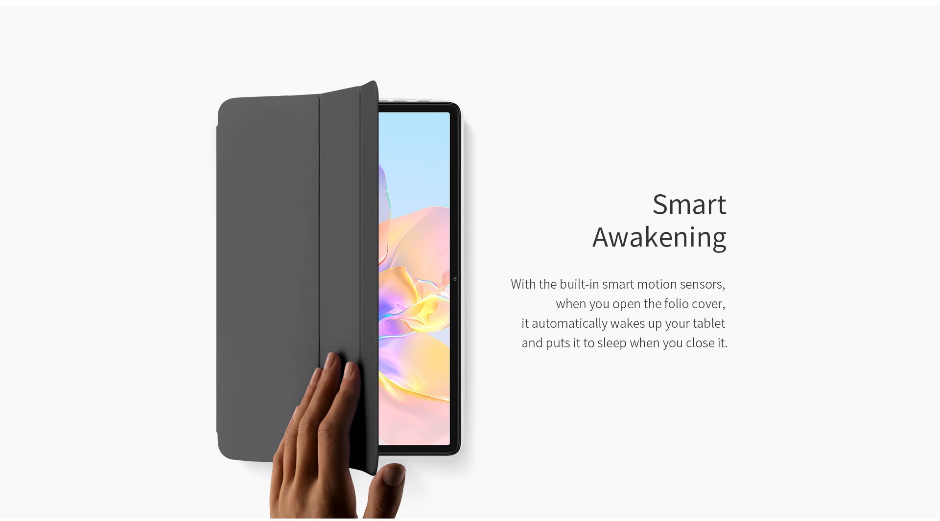 Благодаря встроенным интеллектуальным датчикам движения, когда вы открываете чехол-книжку, планшет автоматически пробуждается и переводит его в спящий режим, когда вы его закрываете.