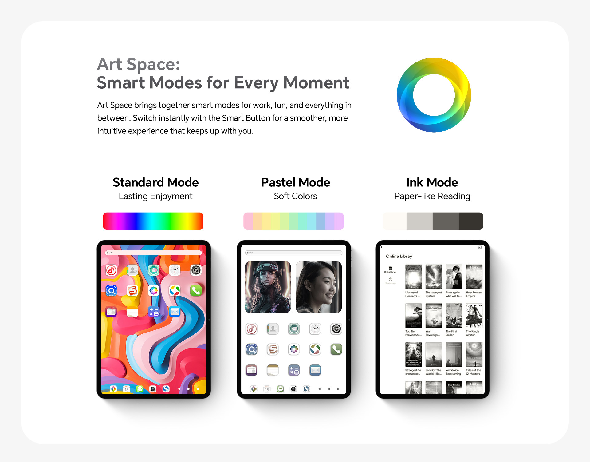 [Android with ArtOS] ArtOS allows you to customize your workspace with profiles designed for specific activities such as drawing or editing. The quick sidebar provides instant access to tools and apps, enhancing multitasking, while assistive control features help users navigate the tablet with ease, offering accessibility to everyone.