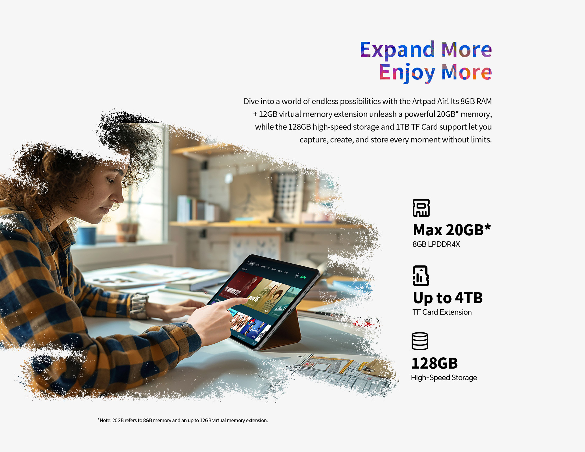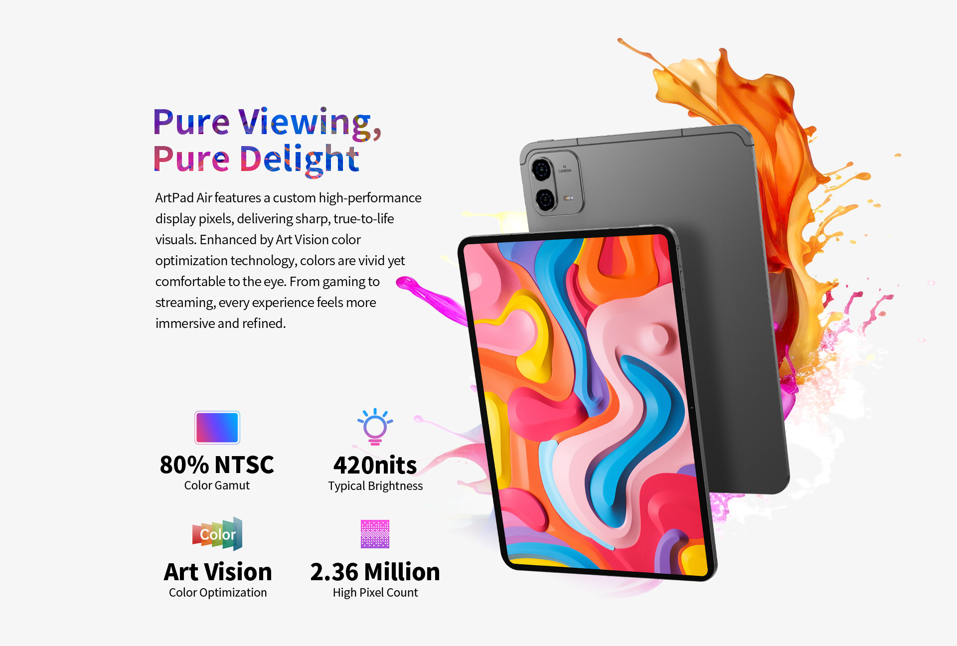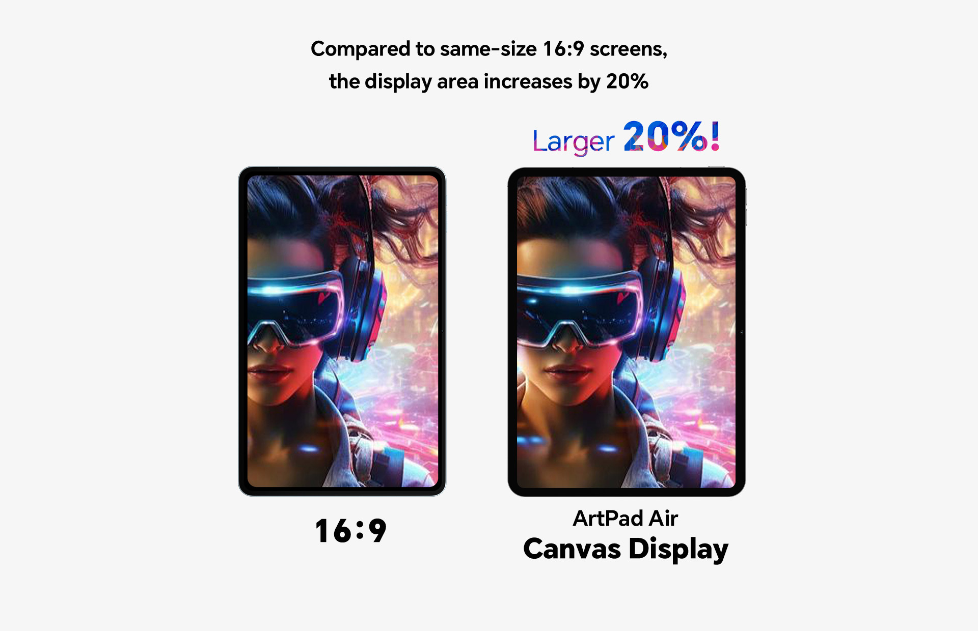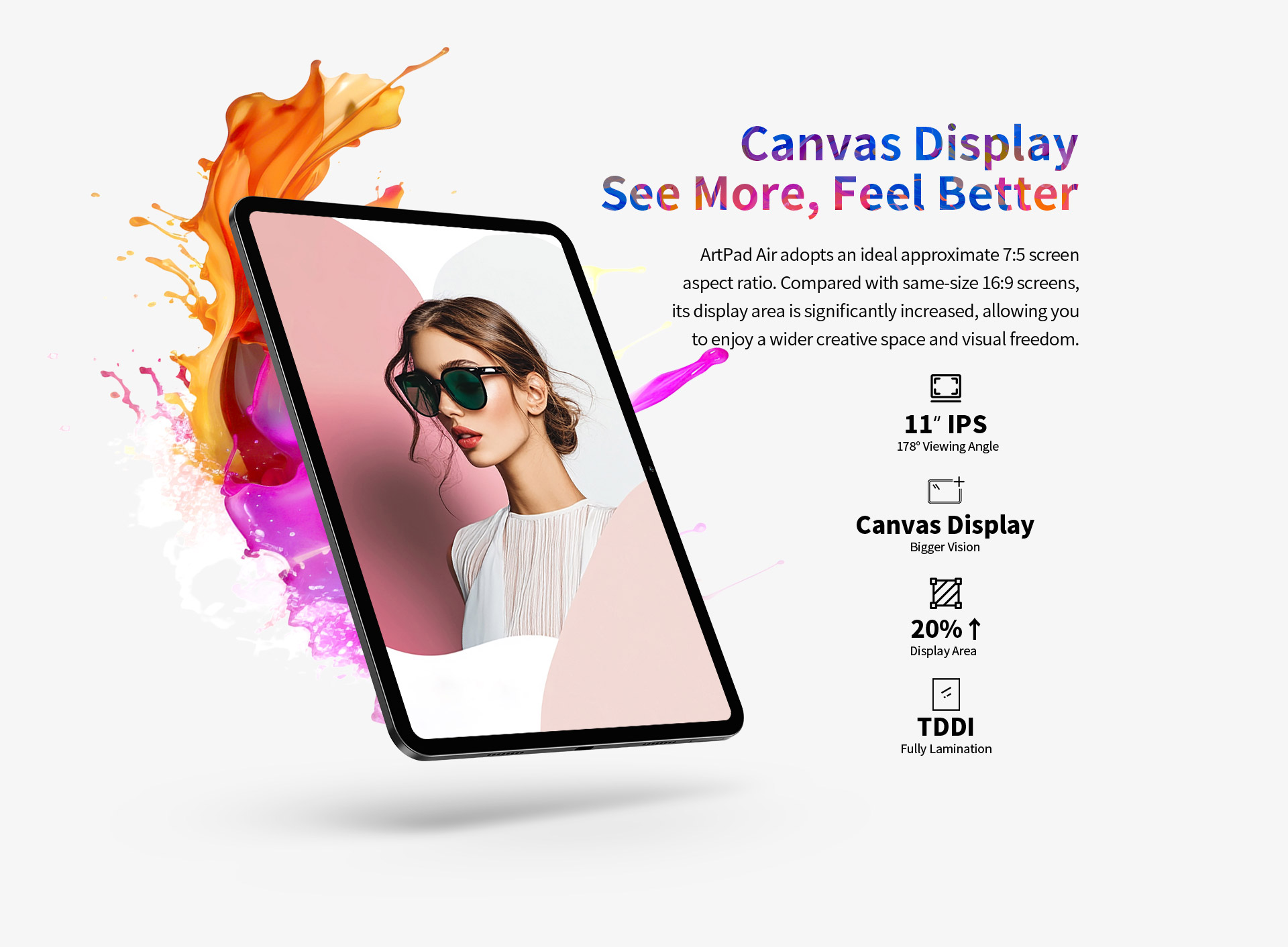 [Canvas Display] The ArtPad Air's Canvas Display features an ideal aspect ratio for creating, offering 20% more workspace compared to standard 16:9 screens. With uniform narrow borders, the design provides a larger, more immersive screen area, making it perfect for references, free creation, and precise edits without distractions.