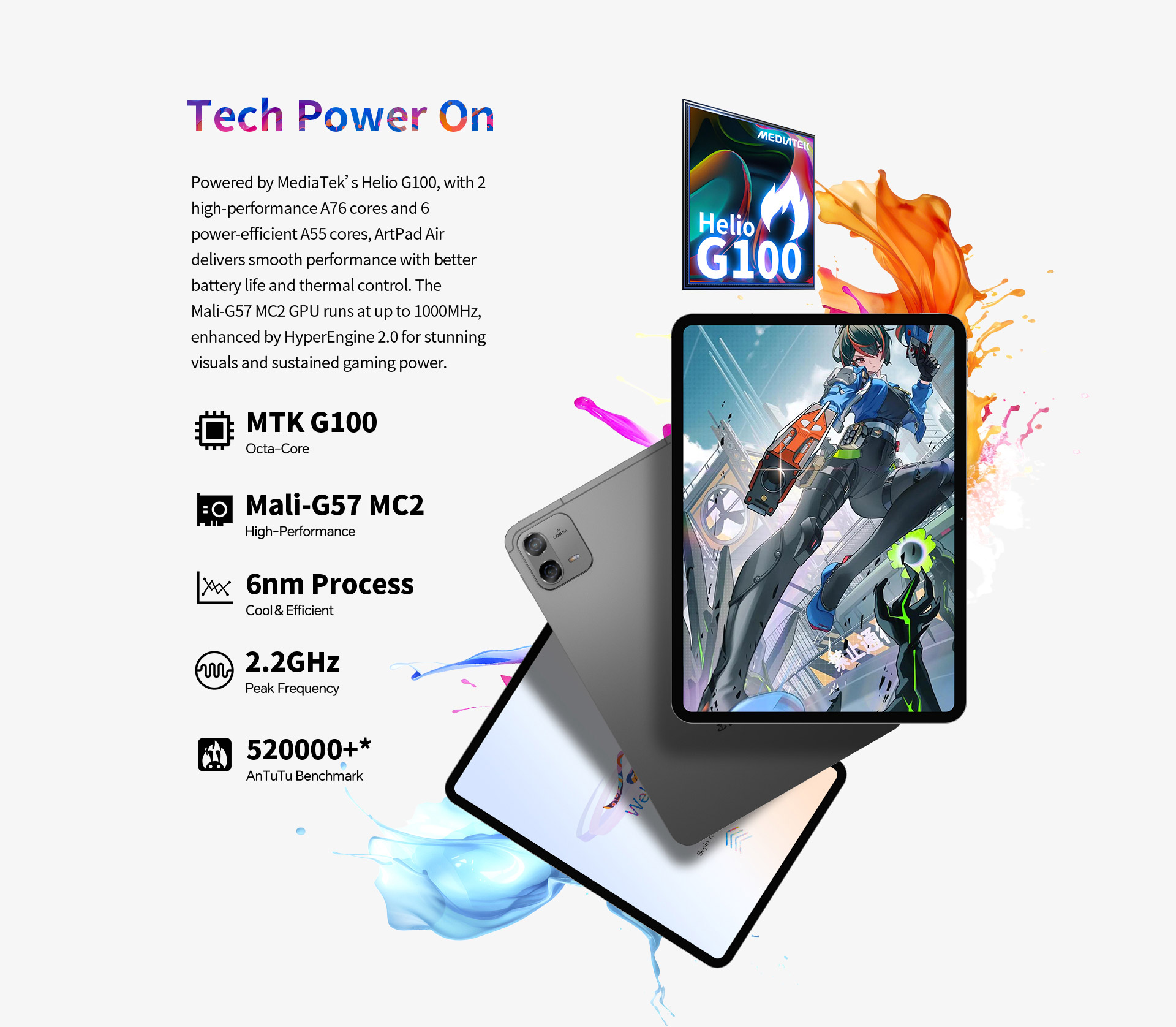 [Premium Performance] Powered by the MTK Helio G100 Octa-Core processor, the device delivers powerful processing for smooth multitasking and fast performance. The efficient 6nm process ensures optimal battery life, while the high AnTuTu score (400000+) demonstrates exceptional system responsiveness and app performance.