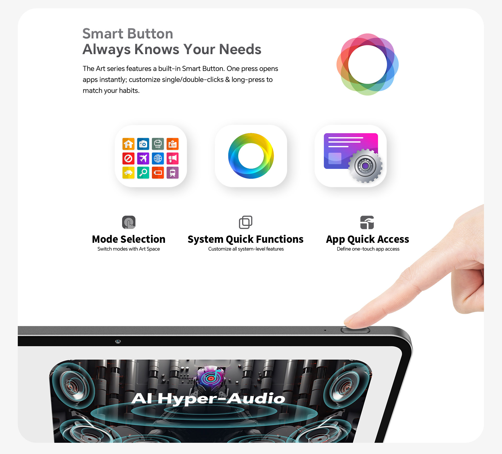[Smart Button] The customizable button function allows you to tailor the button actions to suit your specific needs, streamlining your workflow. Effortlessly switch between modes to adapt to different tasks, and launch your most-used apps instantly with a single tap for seamless access.