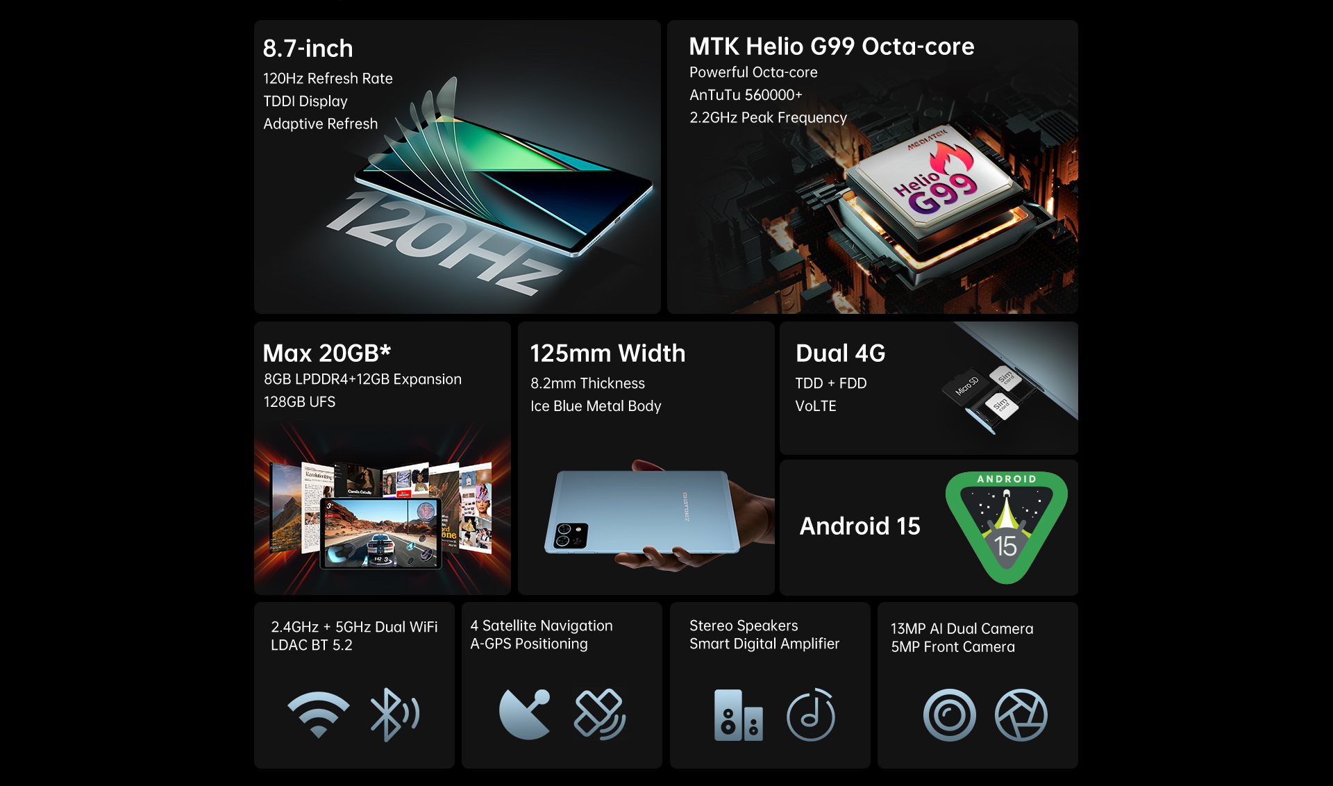 [Fast Connectivity] Enjoy fast 4G connectivity (TDD + FDD) and dual-band Wi-Fi (2.4GHz + 5GHz), plus BT 5.2 for seamless wireless connections.